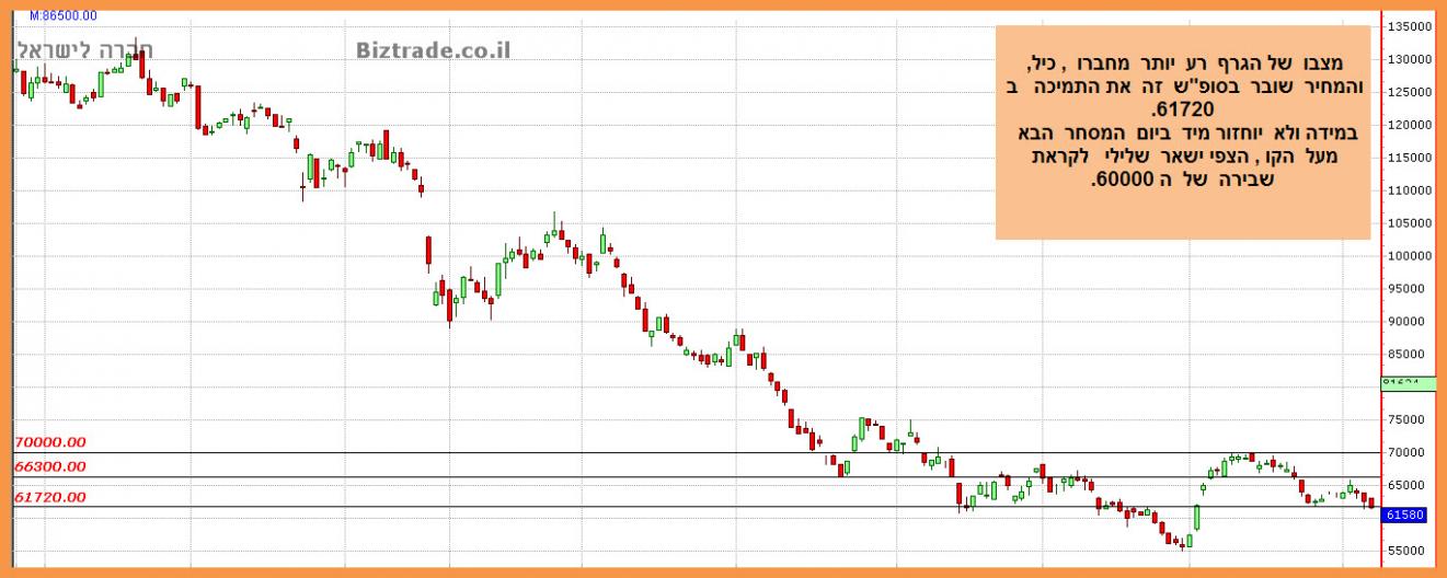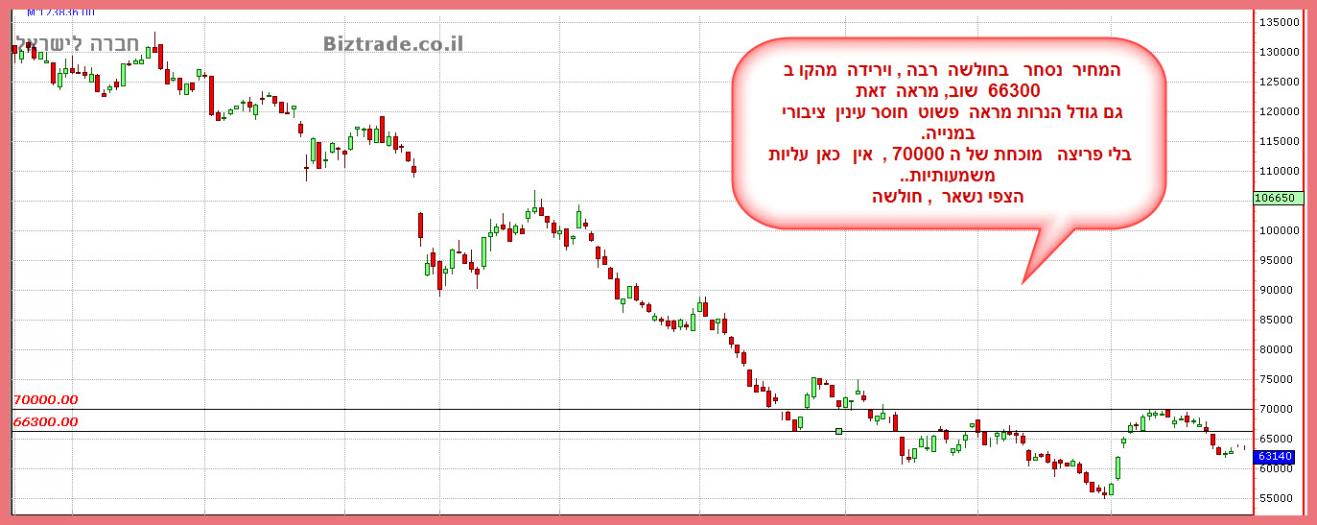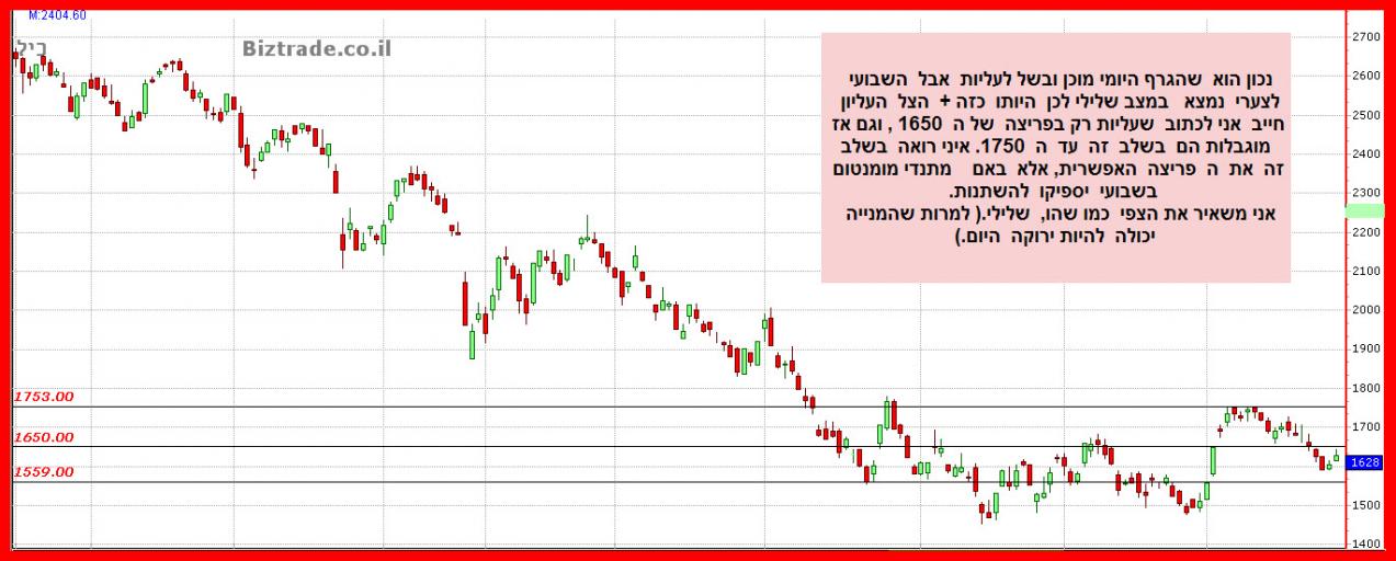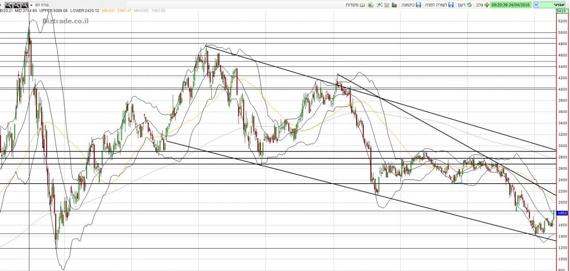 שבועי - מתנהלת בתעלה יורדת ותחת קו מגמה יורד, מתנדים: פרט ל-CCI שבקניות יתר - השאר בסדר, נעצרה בשבוע שעבר על התנגדות. נמצאת מעל ממוצע 20 אך עדיין מתחת לן-50 ול-200, חרגה מהבולינגר