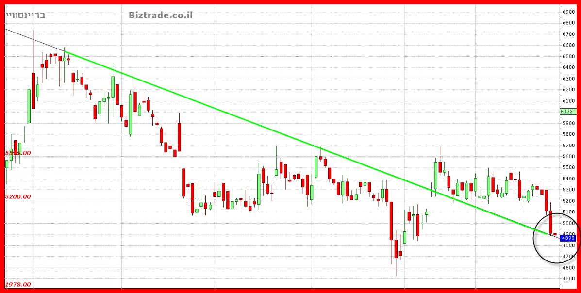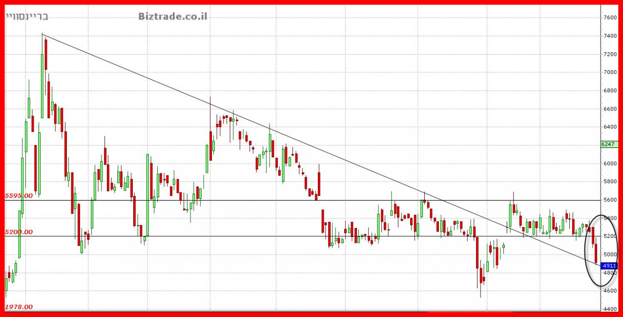 מאז שברה את הקו תמיכה החשוב ב 5200 ביום ד" המחיר ממשיך לצנוח מטה, בקו זה המחיר שהה מעל חודש עבודה, ושבירתו ציין את כוונת המוכרים.