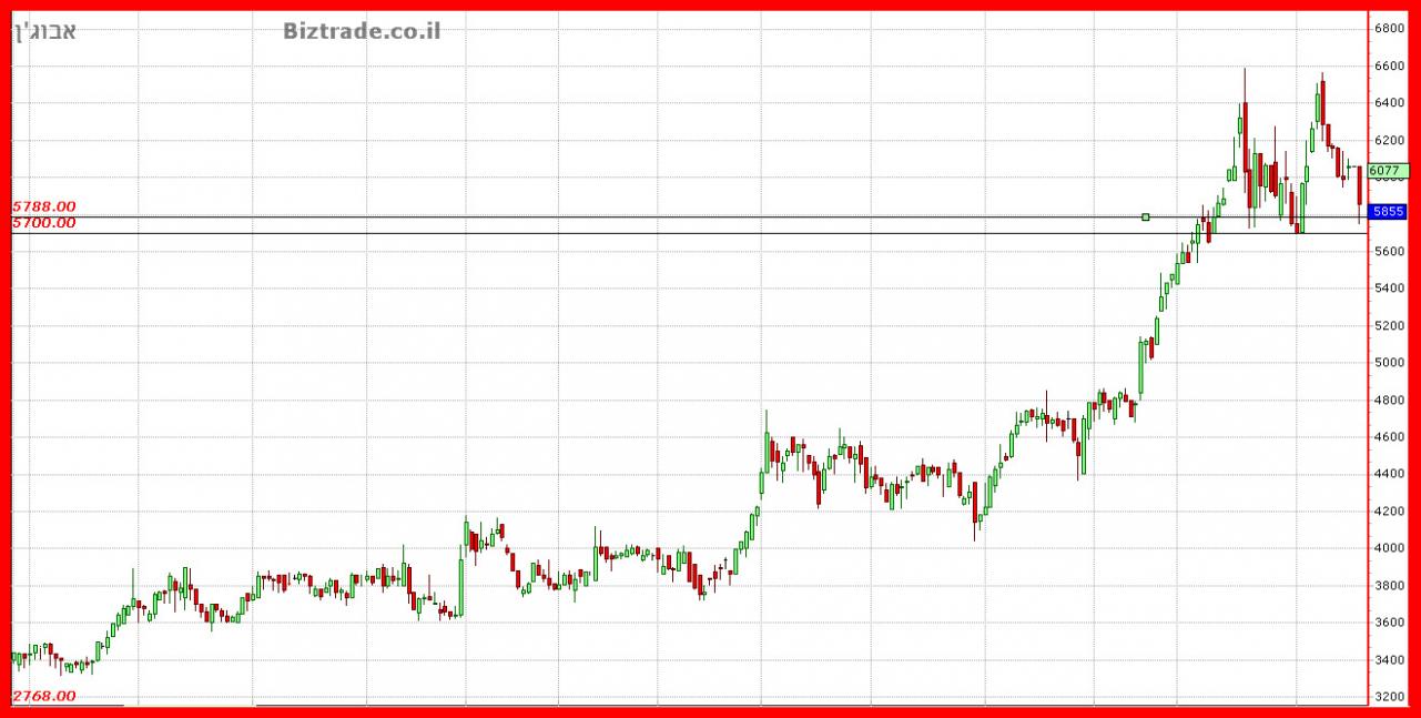 ביצירת תקרה כפולה עם חוסר יכולת פריצה של ה 6400 - 6600 , המחיר יוצא לסבב נוסף של מימושים כאשר התמיכה החשובה באזור נמצאת בין ה 5700 ל 5800 , שאתמול כבר נבדקה,