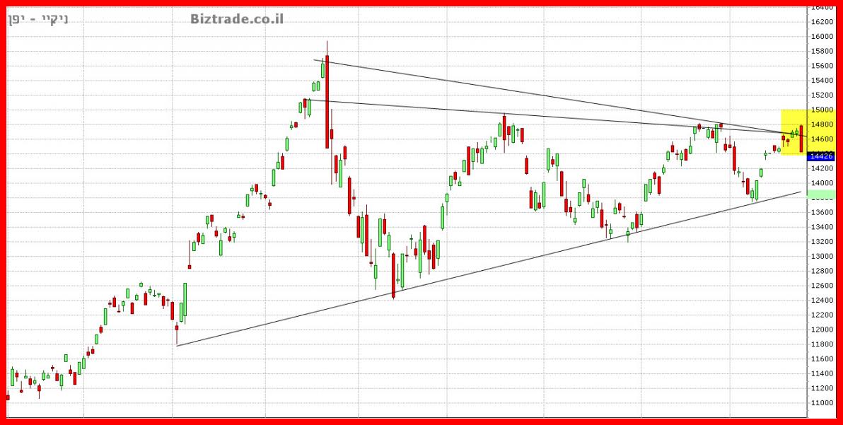 המחיר לא מצליח לפרוץ את ה 14500 וסוגר מתחתיו.