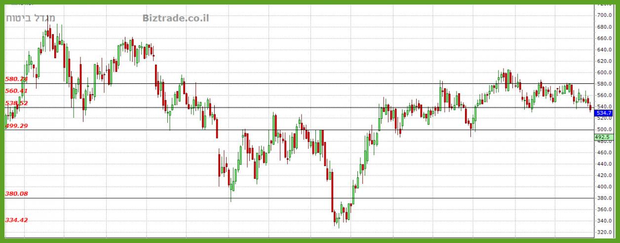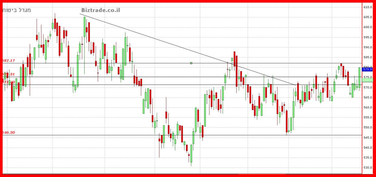 כאשר הסגירה השבועית היא ב 579.9 , עם צפי להמשכיות מעלה.