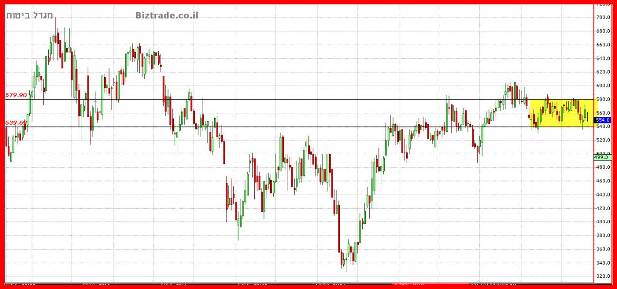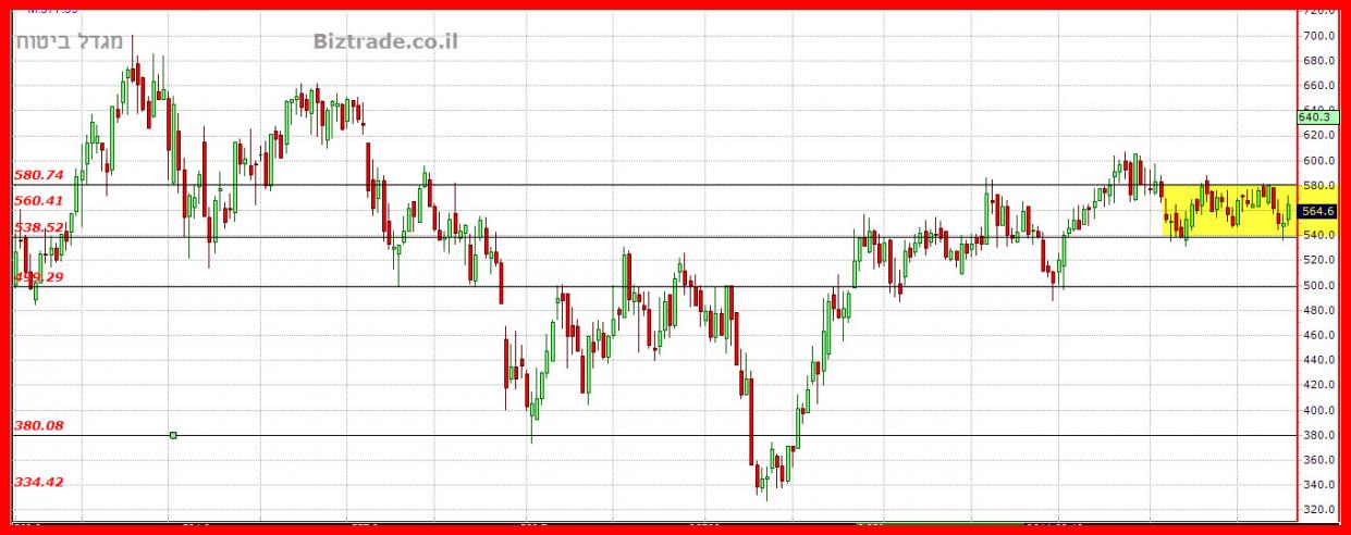המחיר עדיין נמצא בטווח הדשדוש, הנתון בן 540 - 580, כאשר שבירה של הטווח יישלח את המחיר ל 500 ואילו פריצה של הטווח יישלח את המחיר ל 620.