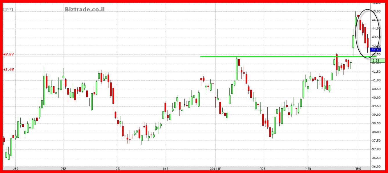 מאז הפריצה והעליות ל 45$ המחיר מתממש במשך 5 ימי מסחר אבל ה נקודה החשובה היא שהוא שומר את עצמו מירידה של קו ה 42.4$ שהוא קו הפריצה וקו תמיכה אופקי חשוב באזור, על כן למרות המימוש, כול עוד המחיר מעליו, הכול בסדר לצורך המשך עליות..