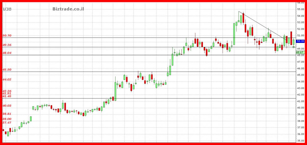 אז כמובן לא אתנבא, לא כאן ולא באף מקום, אבל גרף זה מגיע לדוחות מתוך מגננה ולא עצמה, מה ש מביא אותי לחשוד שהירידות יכולות להימשך, כאשר קו ה 48$, ו 45.5$ הם התמיכות הטכניות הטובות הקרובות למחיר.