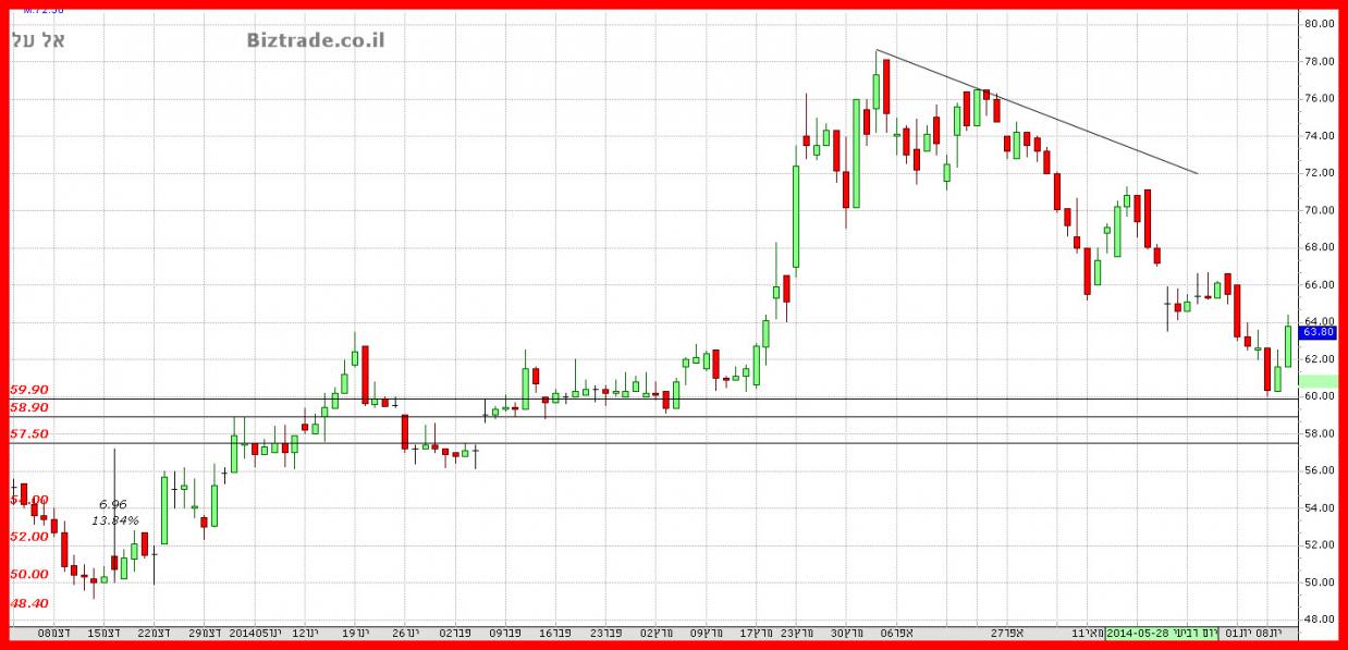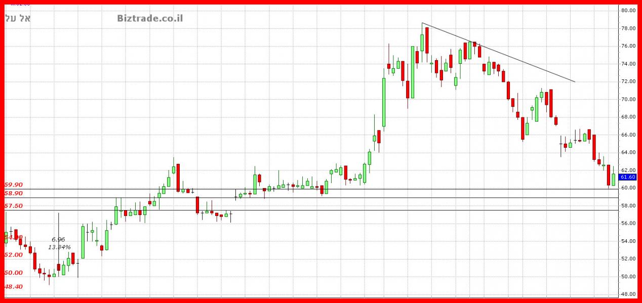 המחיר מצליח לא לרדת היום מתחת ל 60 , ומצד שני הגרף לא נותן איתות כניסה ברור, כך שעקב הצל העליון של הנר היומי, עדיין לא חלפה הסכנה להמשך מטה ל 58 -59, ובכדי שסכנה זו תחלוף, על המחיר לסגור מעל ה 62 - 64.