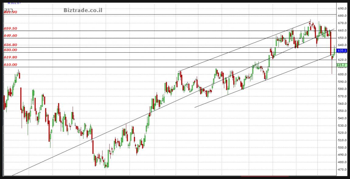 המחיר נמצא במהלך עולה ופריצה החל מקו ה 620 בו יצר היפוך ולאחר תמיכה ב קו ה 600.