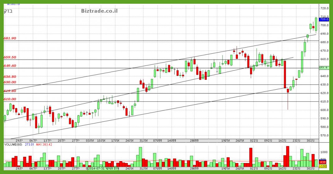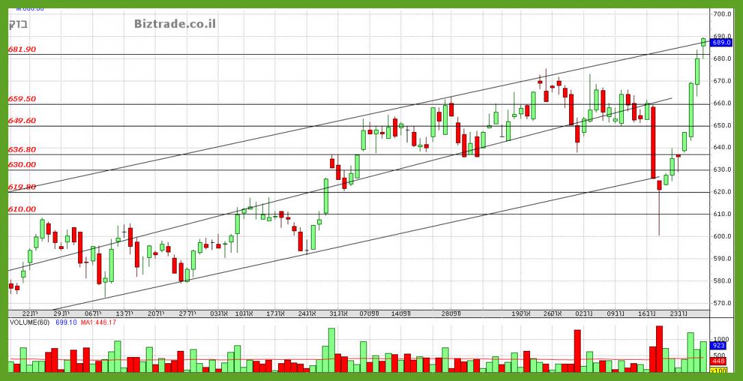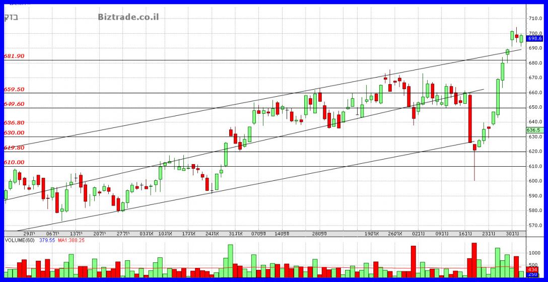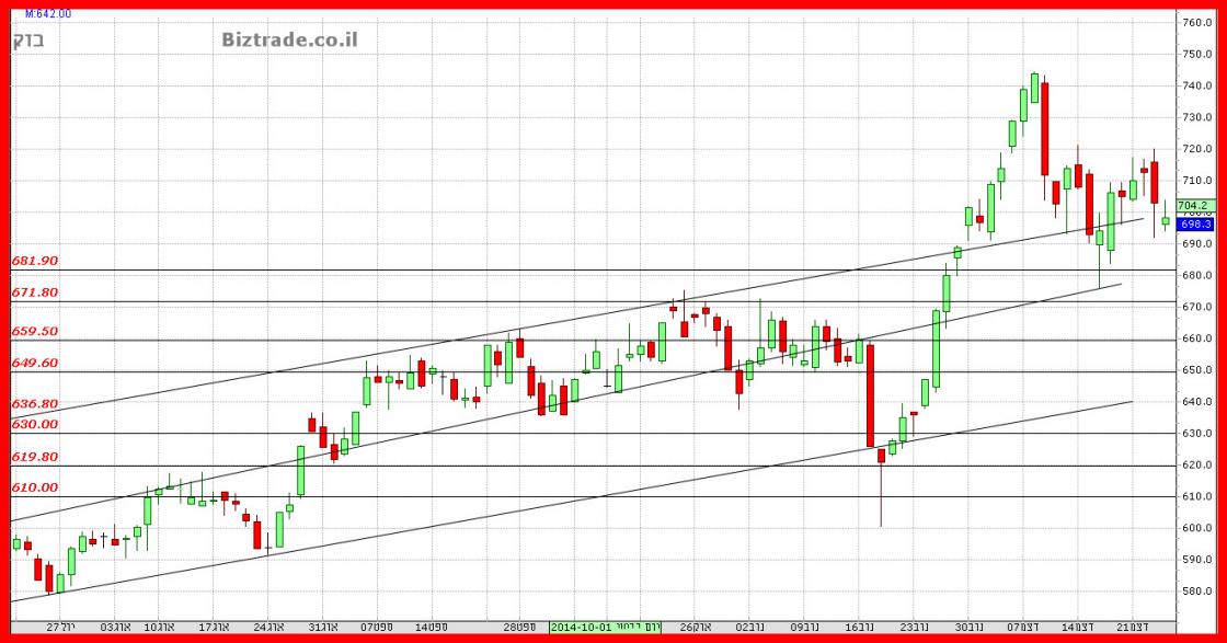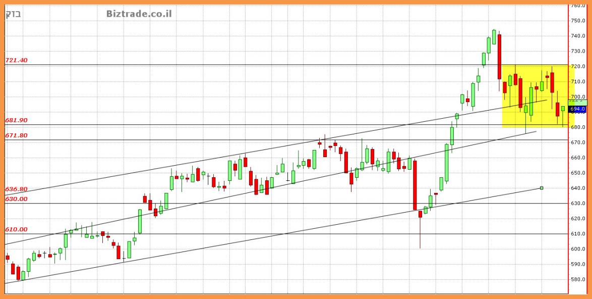 לאחר נגיעה ב 680 המחיר מתרומם ומסיים היום חיובי, כאשר כרגע ניתן לומר טכנית שהגרף נכנס למצב דשדוש , והטווח הוא , 680 בנמוך, ו720 בגבוה,