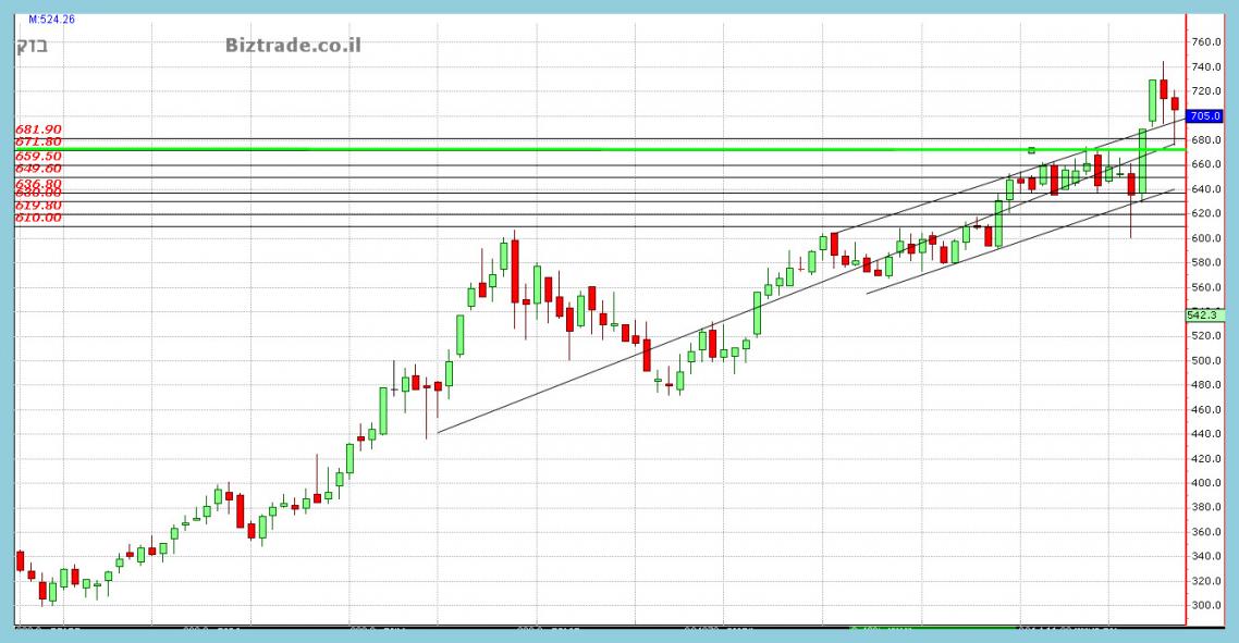 אנו נמצאים כאן במחירי שיא, על כן כוחות הטכני כאן דלים, ולא ניתן לומר באחוזים טובים עד איכן הוא ימשוך מעלה ולכן כול עוד המחיר נמצא מעל קו ה 693 ( כול יום מסחר מעלה את הקו קצת מעלה ), אזי הוא חיובי להמשך.