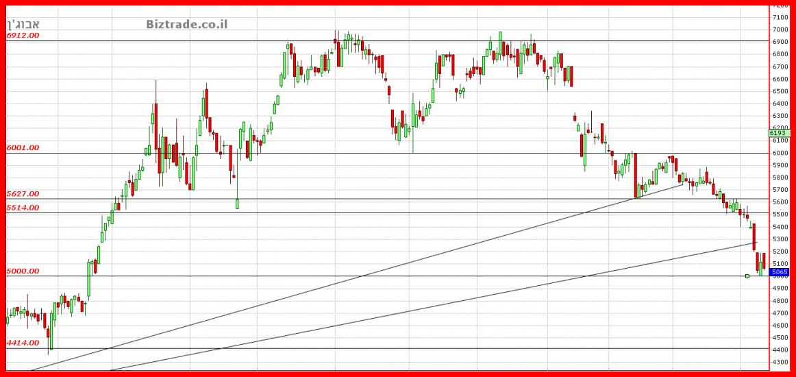 כרגע המחיר מגיע לסגירה שבועית סביב ה 5000. ונסחר באופן חלש , וסכנת שבירת הקו הזה וירידה ל 4800 שהיה כבר יעד מזמן , קיימת.