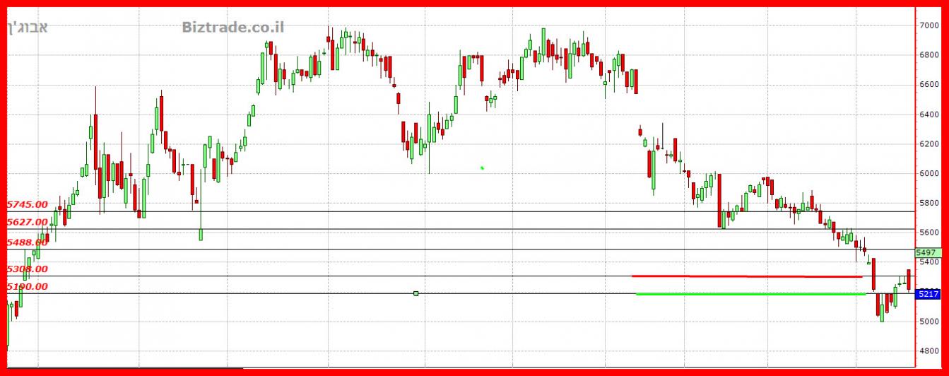 כפי שנכתב בעדכון של סופ"ש, שני טווחי הזמן , שבועי ויומי, חנוקים במכירות יתר ואתמול המחיר נתמך על ה 5100 , והיום כבר ממשיך את עלייתו לאחר פריצת ה 5200.