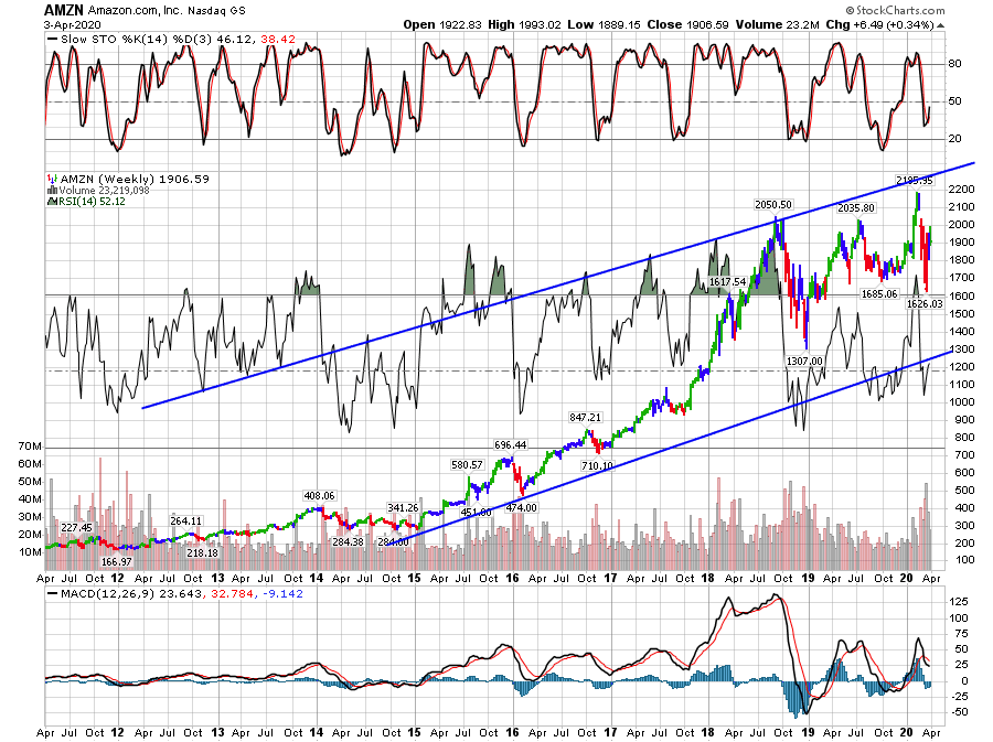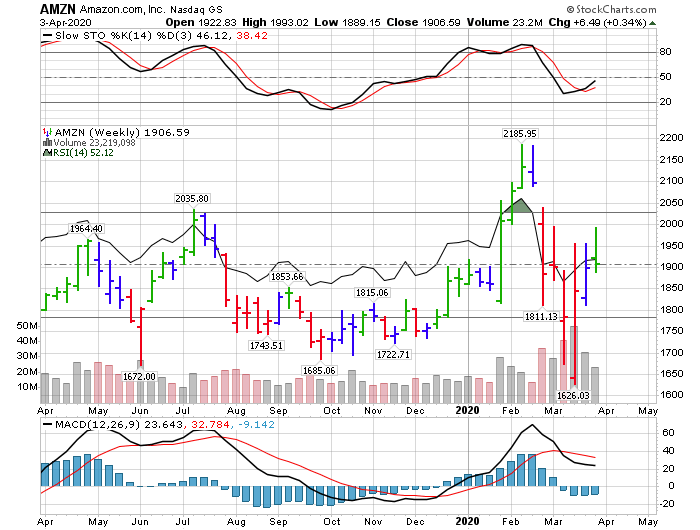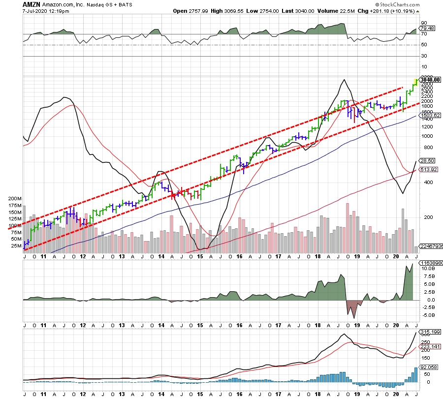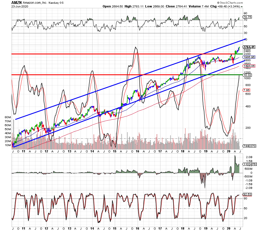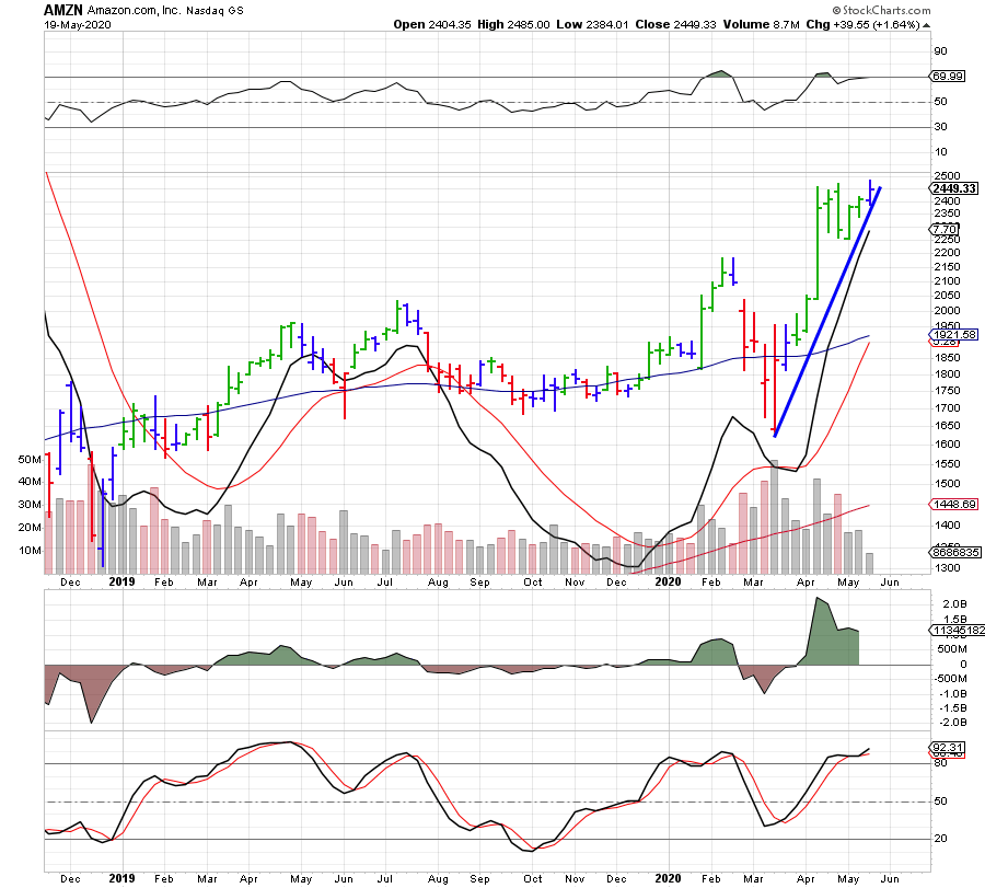הגרף השבועי מראה את המגמה השורית של הענק אמזון. קו המגמה הצומח מעלה מכוון את העמודות להיפוך ברמת מחיר של כ-2590 דולר. בכלל הדישדוש והתנועה הצידית באפריל-מאי מראה צבירה ובחינת ההתנגדויות לפני ההתקדמות הבאה. רוב המתנדים הינם שוריים ועוצמתיים כעת. התנועה מעל ממוצעים של 200 ו-50 ימים. ה-RSI ברמת ה-70% והסטוקסטי מדשדש ברמת הקניית יתר.