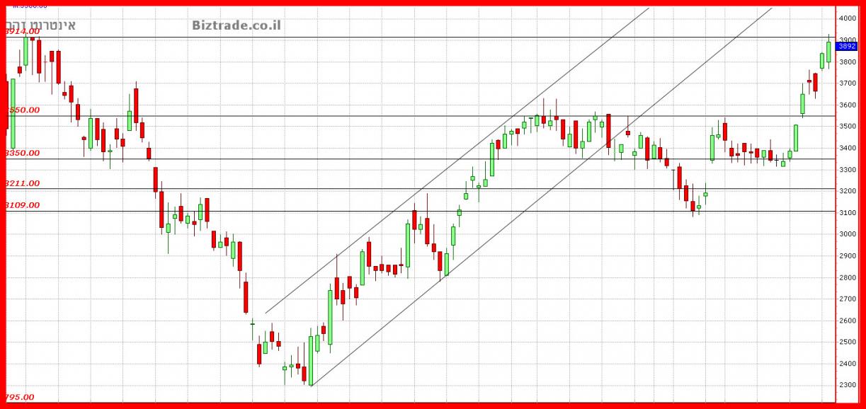 קו ה 3914 , הוא קו טכני חזק יותר מה 4000 , כך שכאשר דובר על גרף זה לפני מספר ימים , כתבתי שלא רואה את הגרף מעל ה 4000 -וזאת בתנאי שבכלל פורץ כאן את ה 3914 , שהמחיר ניסה אתמול לפרוץ אבל לא הצליח.