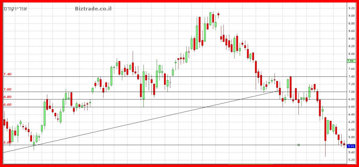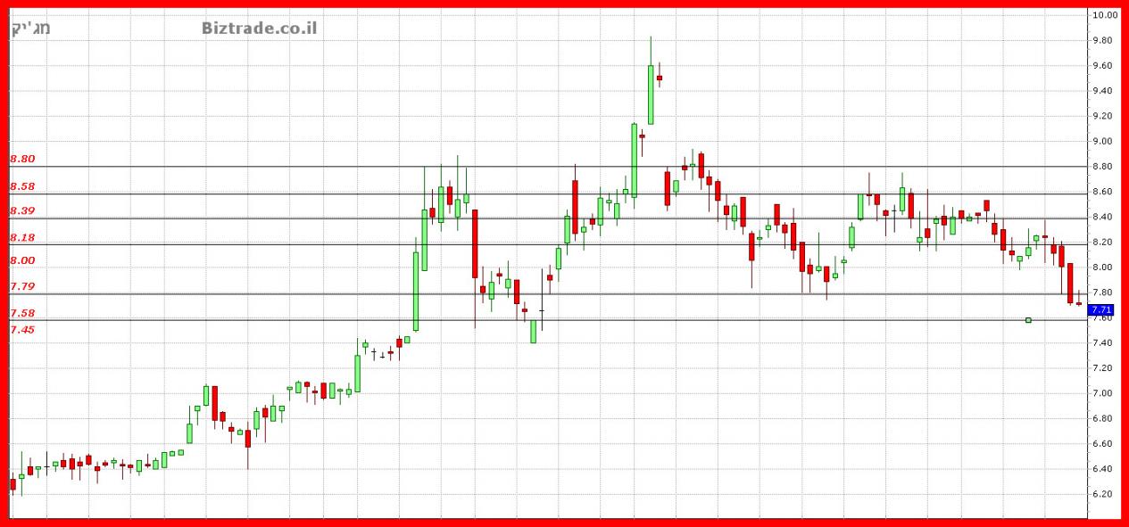 החולשה ממשיכה לשלוט על גרף זה , ושלשום המחיר שובר תמיכה ב 7.8$ , ואתמול המחיר כבר בדק את ה קו כהתנגדות , וללא יכולת פריצה.