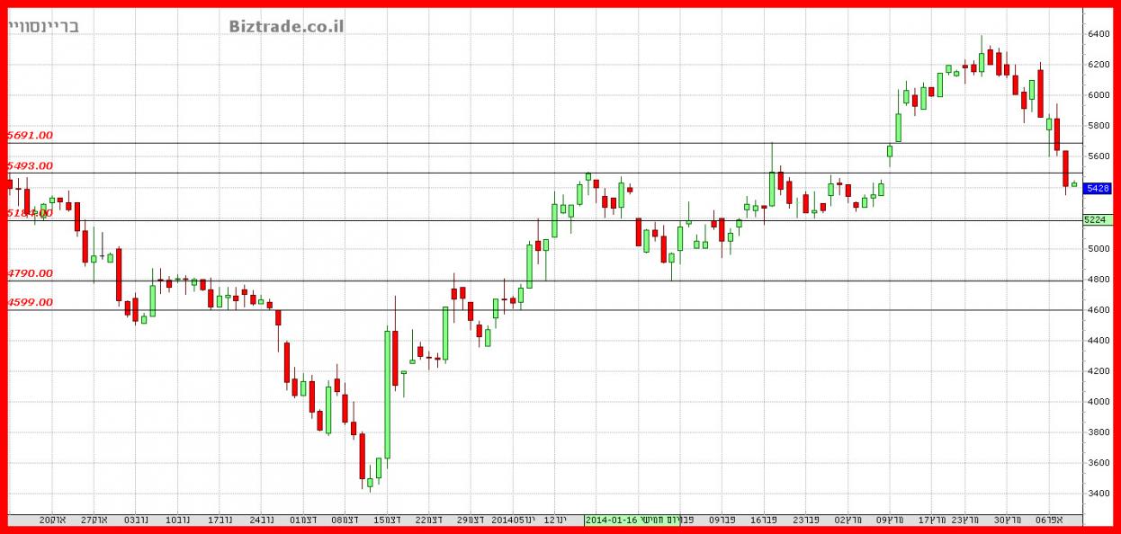 לחץ המוכרים ממשיך בגרף זה , כאשר היום נשבר קו אופקי ב 5690 , והמחיר מתקרב מאוד לקו האופקי החשוב באזור ב 5493,