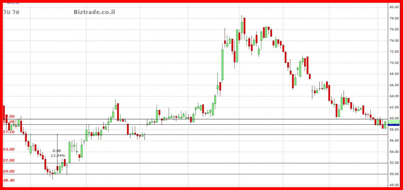 המחיר מנסה להתבסס על קו ה 59, אבל בלי פריצה של ה 60 , זו יכולה להיות עסקה בסיכון גבוה יותר, כך שעדיף להמתין להחלטה בגרף , כי כול עוד המחיר מתחת ל 60 = אפשרות לירידה ל 58.