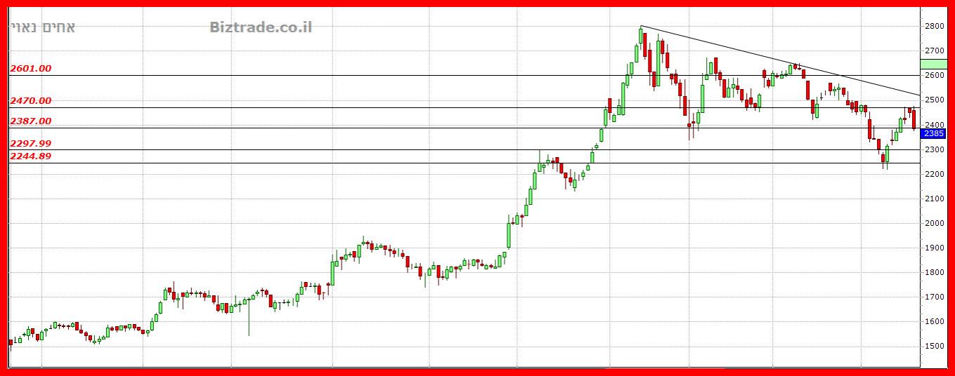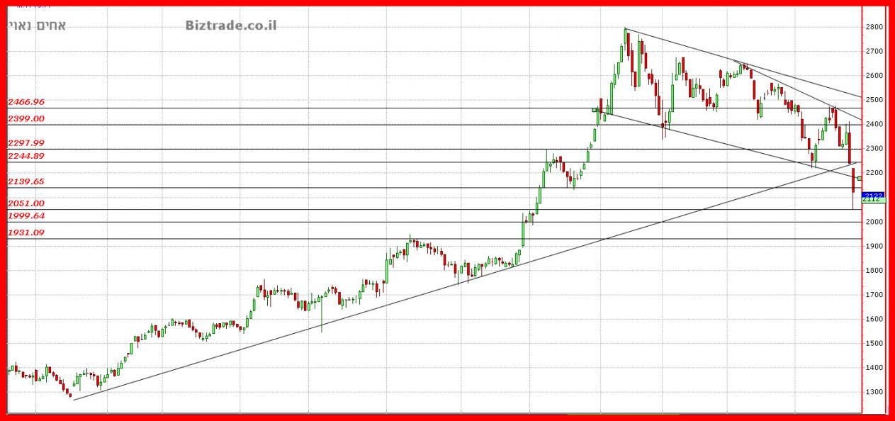 המחיר הגיע היום ל 2051 כאשר בימים האחרונים , לא מצליח לפרוץ את ההתנגדות ב 2400 , ושובר את ה 2300 -- 2200 -- 2140. + תעלה יורדת + קו מגמה עולה ארוך טווח.
