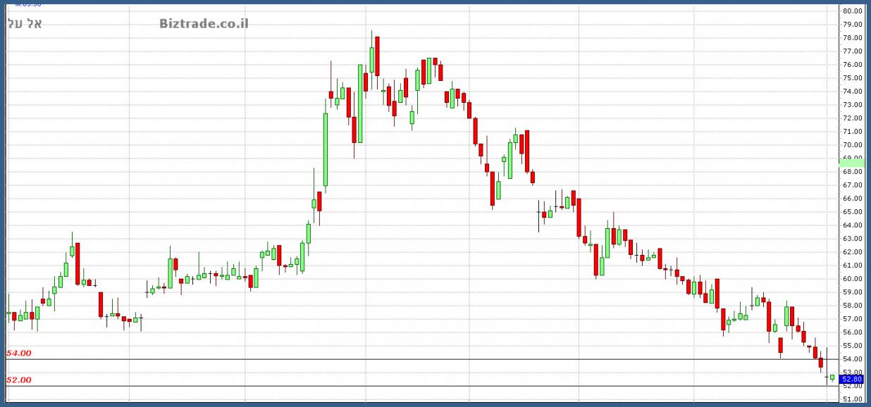 אתמול המחיר נגע גם בתמיכה טובה ב 52 וגם ניסה לפרוץ התנגדות טובה ב 54 , ובינתיים ללא הצלחה.