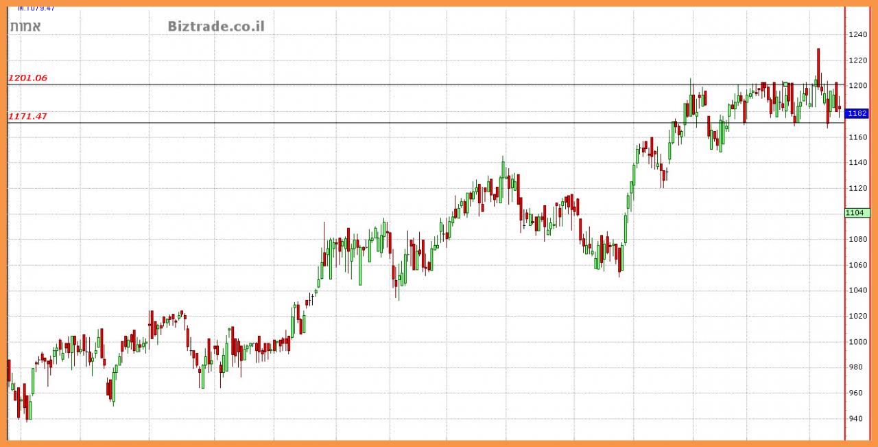 כיוון או תנועה לגרף ייווצר רק על ידי פריצה של ה 1200 , או שבירה של ה 1170.