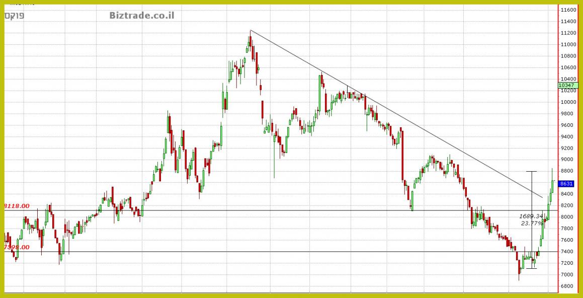 לאחר הגעה אתמול ל 8800 , המחיר התממש חזרה קלות לסגירה ב 8630.