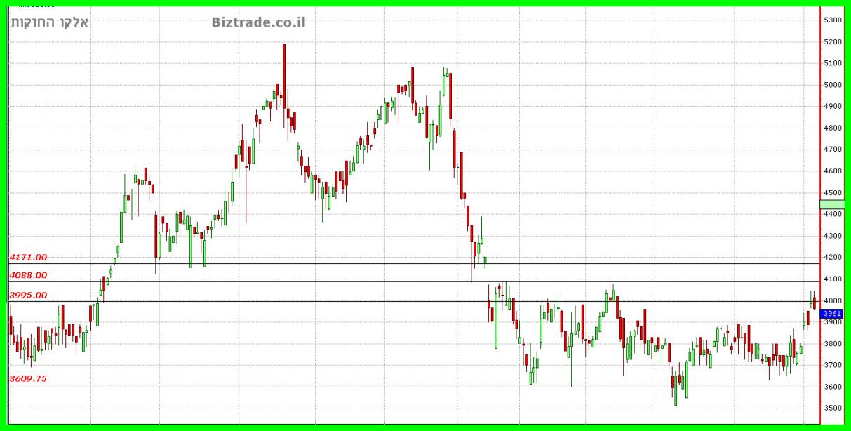 השוק והמוכרים אמרו את דברם ! אין עליות כרגע, ובכך אפילו אין ניסיון התקרבות לקו החשוב באזור ב 4170, כי בלי פריצה של קו זה , העתיד של הגרף הוא להיסחר בין ה 3600 - 4100,