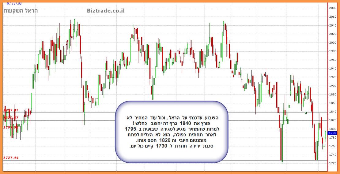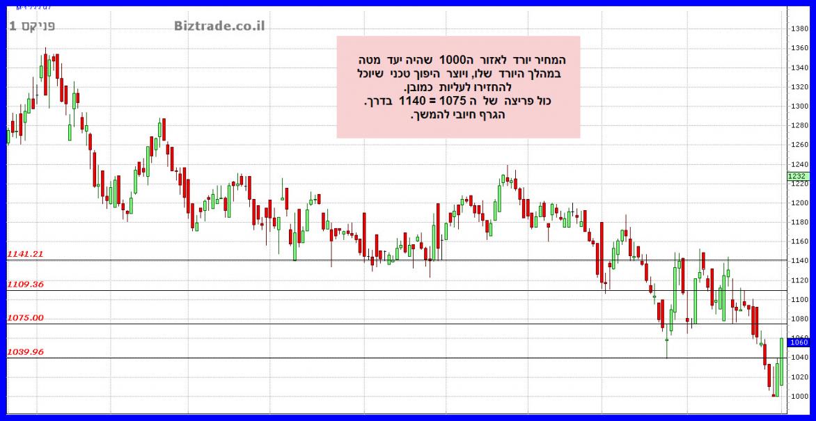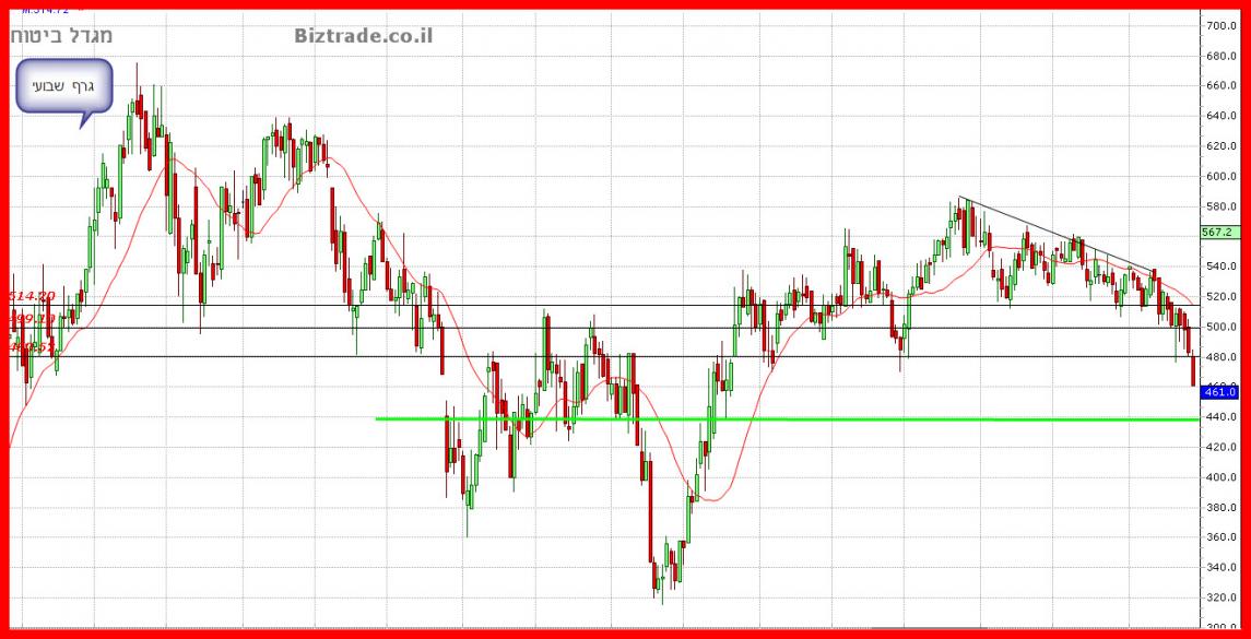 גם גרף זה מאוד מחובר לעדכון של סופ"ש,, כאשר רואים בצילום את הגרף השבועי שובר השבוע את ה 460 וממשיך ישירות מטה לקרת ה 440.