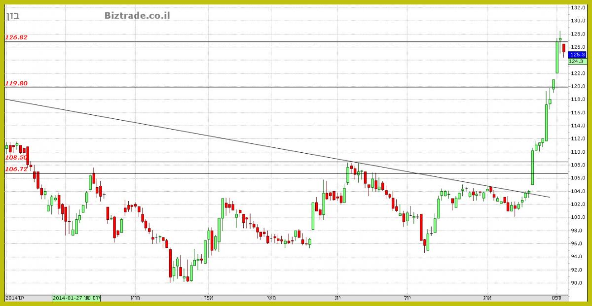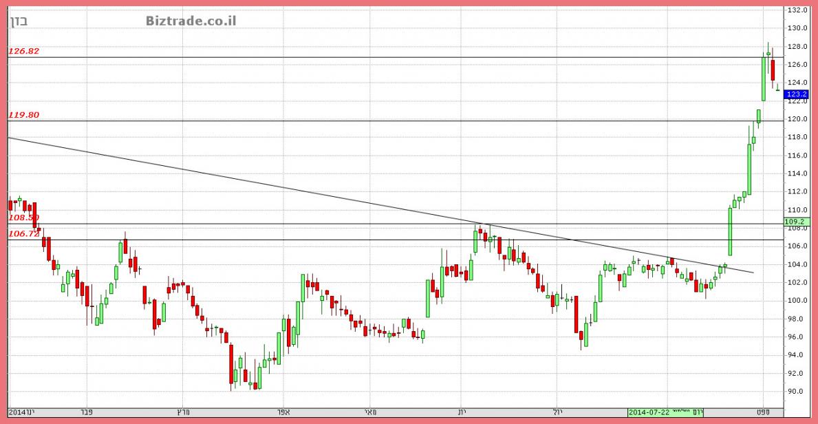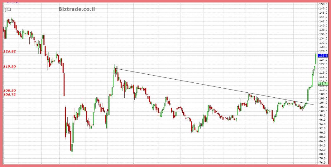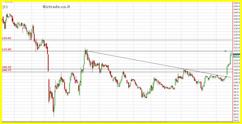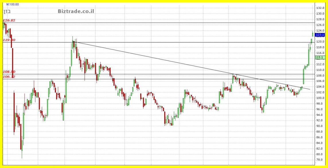 אתמול כתבתי שהיעד הנראה כרגע הוא 120 , וזה נכתב כאשר המחיר היה ב 114, עקב הסגירה החזקה, אני חייב לשנות את היעד האפשרי ל 126 לסבב זה.