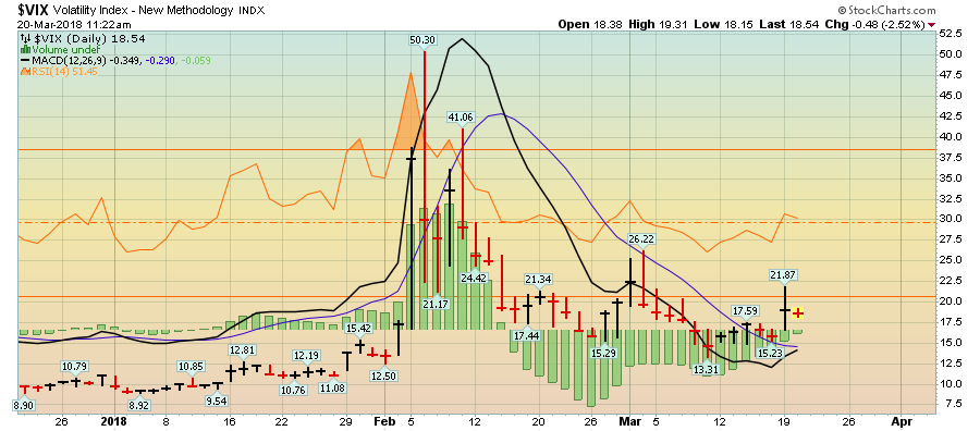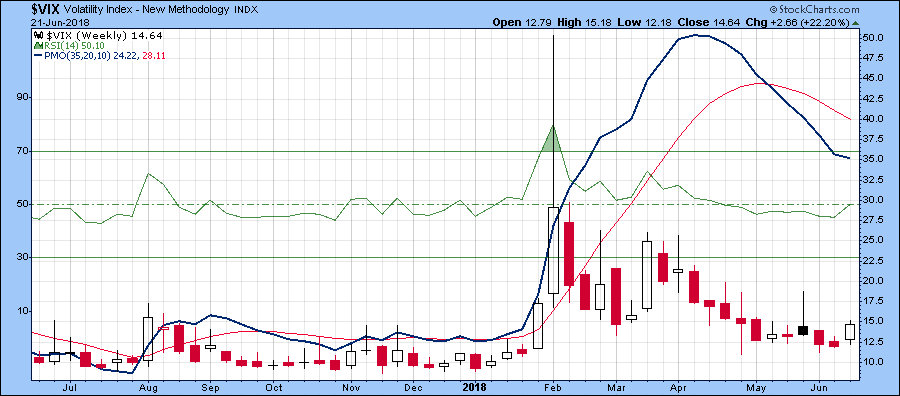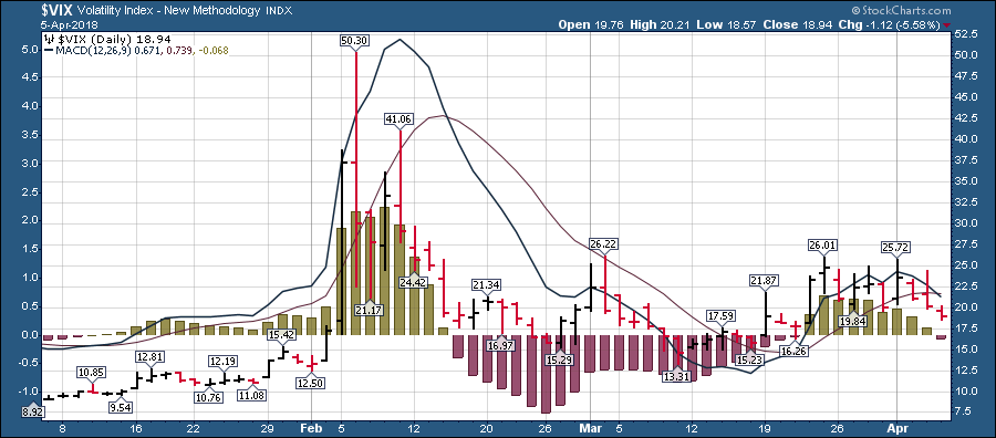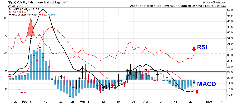 מדד ה-VIX או מה שמשקף את פחדי המשקיעים, עזב את איזורי האופטימיות ברמת ה-15 נק'. מחציית רמת ההתנגדות של 21.5 נק' נכנס הגרף לאיזור לא יציב . הגרף כעת מסמן רמות חדשות של התנגדות באיזורי ה-26 וה-31 נק'. הממוצע הנע בתחתית הגרף מציין שינוי יחסי של צמיחה. גם מתנד ה-RSI שבצבע ירוק מראה רמות לונגיות של 62% מה שנראה כהתפתחות. המגמה הראשית הדובית צופה שינוי לשוריות מעל שער 35 נק'. אם מגמה זו (קו המגמה הדובי) תשבר רמות התנגדות גבוהות יותר משמעותית יווצרו.
