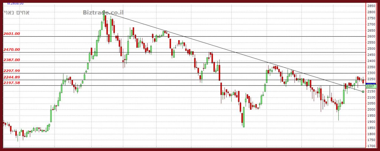 שבירה של 2250 מסכנת קצת את העליות, כי הקו המגן נמצא קרוב ב 2180 הוא אותו קו מגמה יורד אשר יוכל לתמוך במחיר .