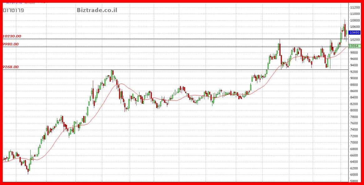 בסופ"ש נתתי לגרף זה צפי שלילי , ואמנם התמיכה ב 10200 נשברה בתוך יומי, אבל הקונים מיהרו להיכנס חזרה ולהרים את המחיר מעליה.