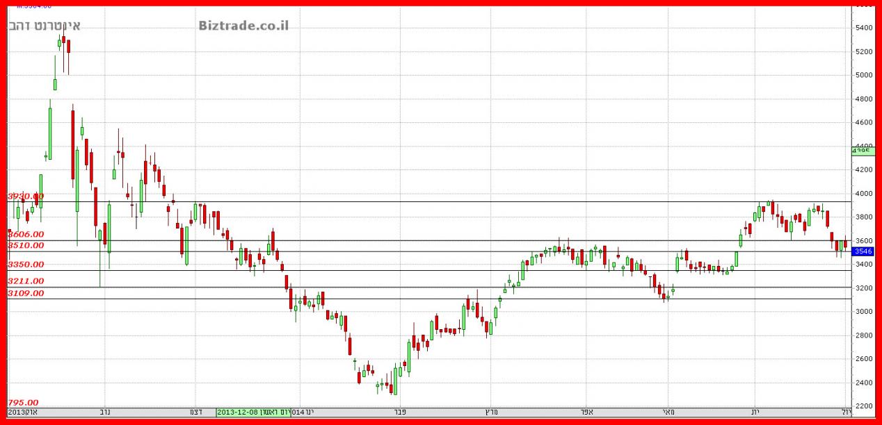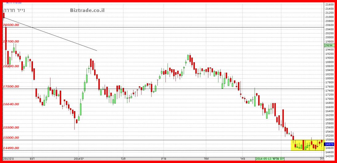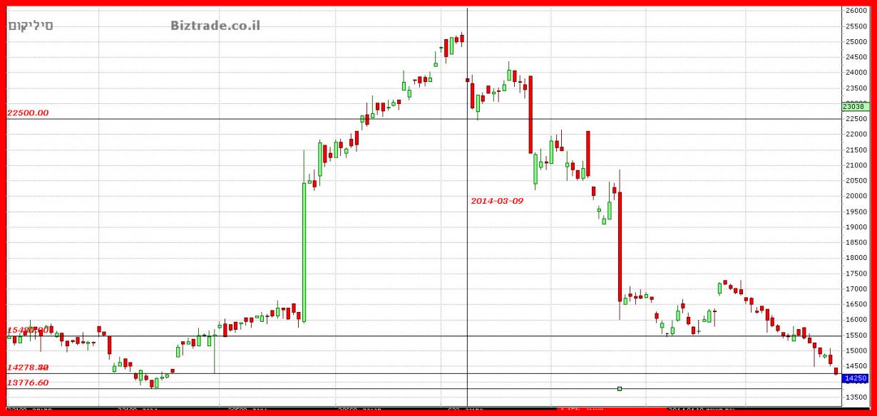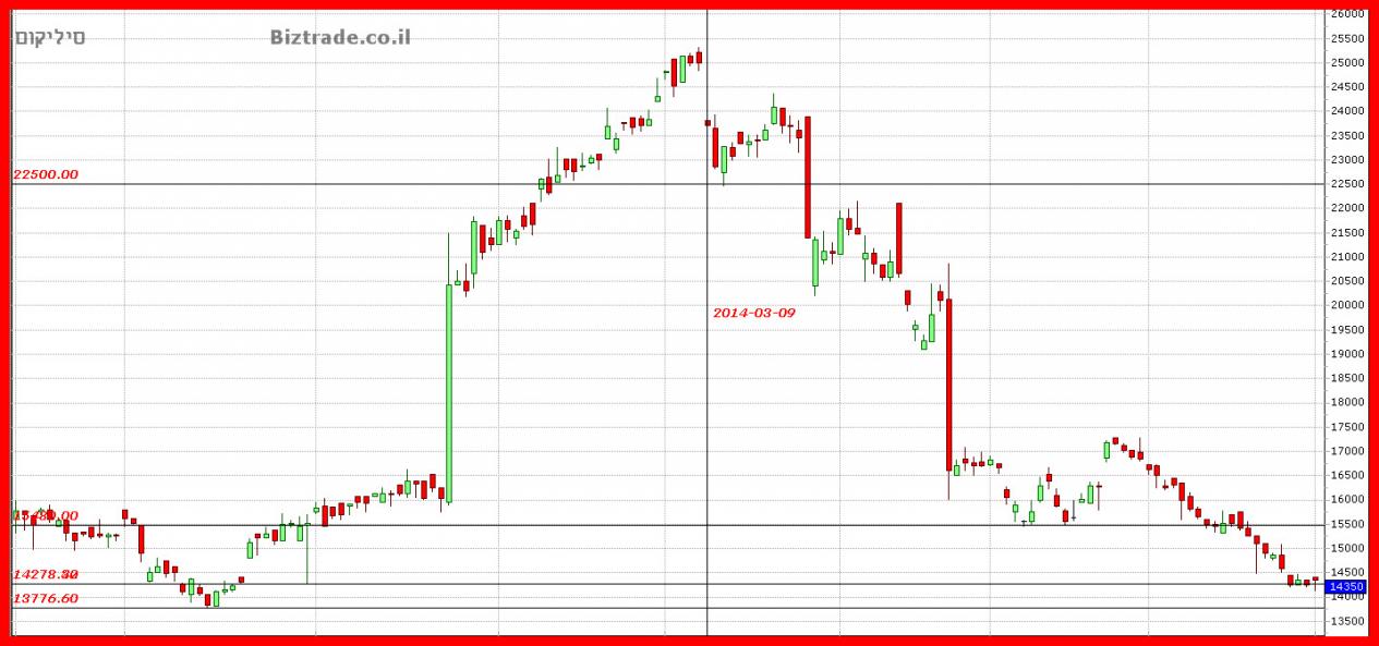 המחיר נמצא במהלך יורד מאז קו ה 25200, וביום חמישי האחרון המחיר גם שובר תמיכה נוספת ב 14280 , כך שטכנית לפחות המחיר בדרכו ל 13775. אלא באם כבר ביום א" הקרוב המחר יעלה חזרה מעל קו זה.