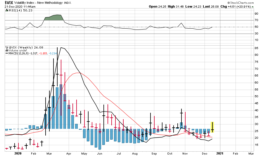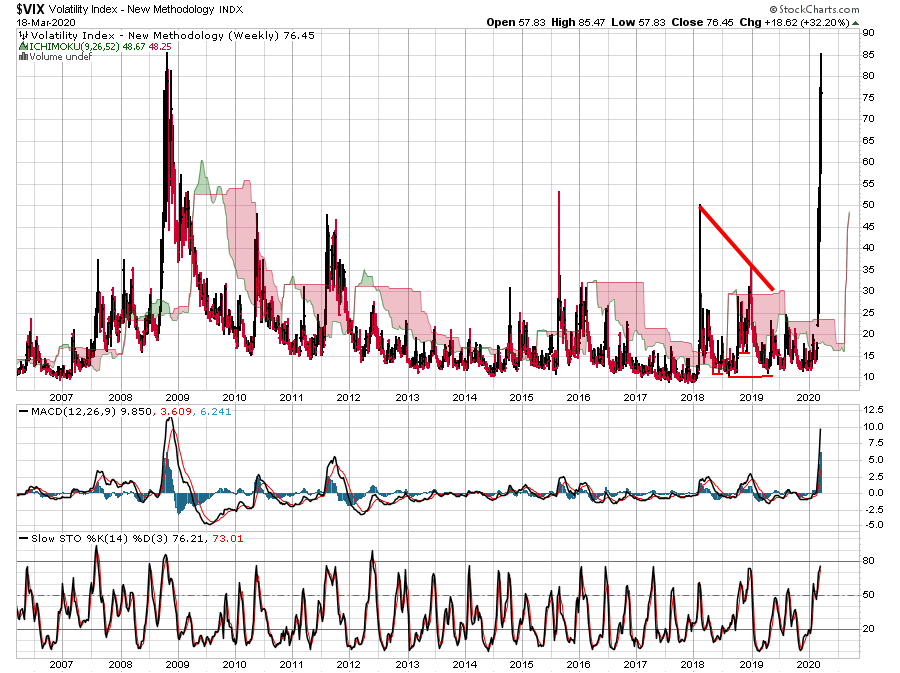 המדד צומח באפן דומה מאוד למשבר 2008 כפי שרואים גם בעמודות אך גם בענן האיצ'ימוקו. לגרף השבועי יש נטיה לתיקון עד איזור ה-40 נק' לפני שישוב לנסוק לרמות חדשות.