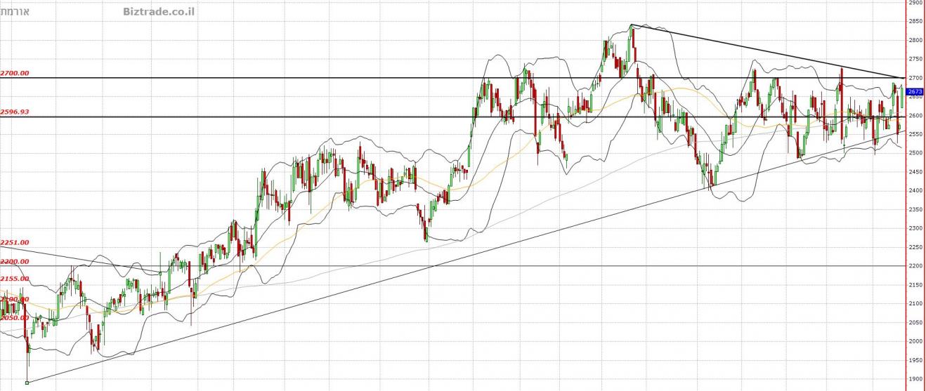 קו מגמה עולה אשר כול פעם מכניס קונים מוקדם יותר, ומעל הראש קו אופקו ב 2700,