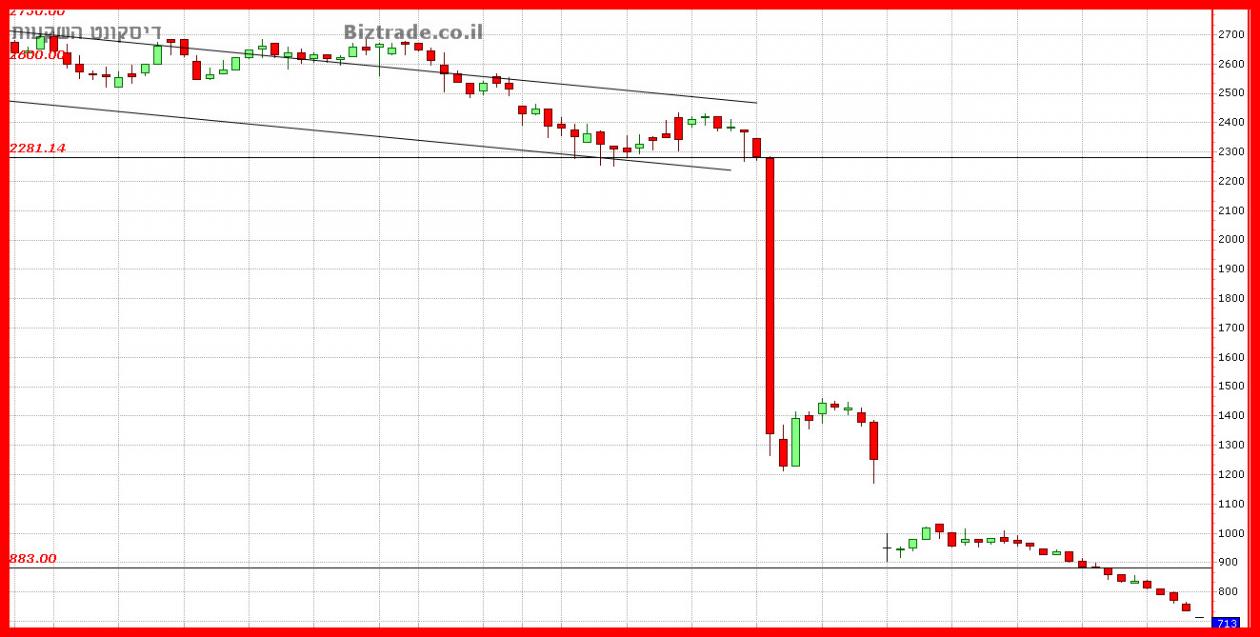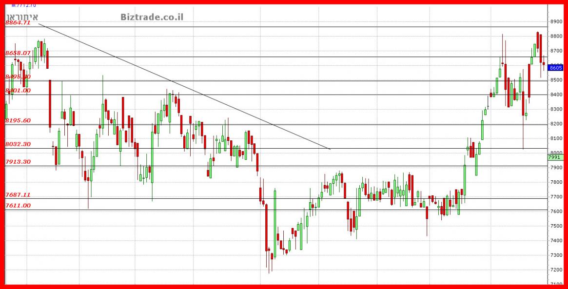 הגרף מתחבר מיד לעדכון בסופש" כאשר הוא מנסה תחילה לעלות לקו ההתנגדות ב 8660, ומשם המוכרים מתחילים ללחוץ מטה, וכרגע המחיר נסחר מתחת לתמיכה ב 8500.