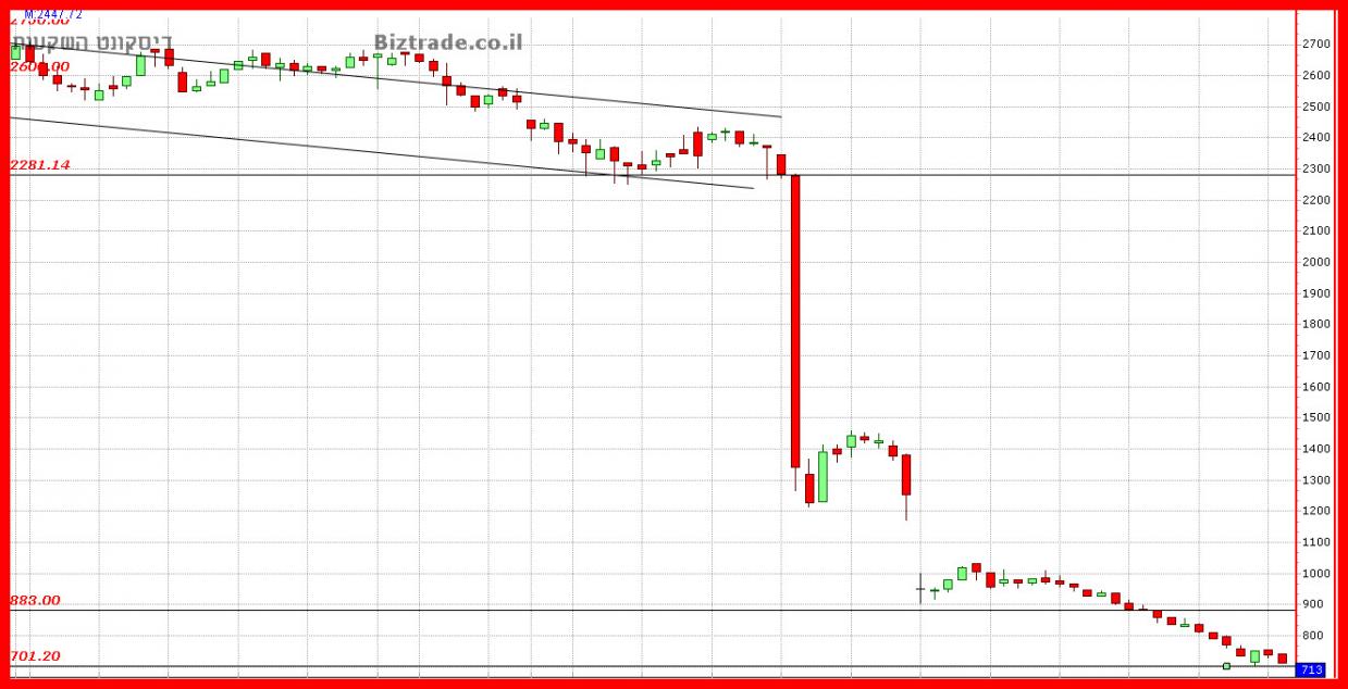 למרות שכבר קיים שפל נמוך מהערך של היום המוכרים לא עוצרים וממשיכים ללחוץ כאשר הסבב ירידות הנוסף הזה משאיר בסכנה ברורה את ה קו ה 700, כאשר כרגע המחיר נסחר סביב ה 713.