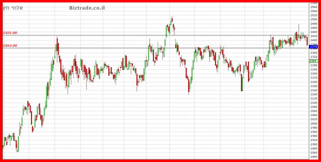 בעדכון האחרון נרשם שההתנגדות הקרובה ב 2368 , והמחיר חוצה אותה מעלה והלך לסגירה ב 2400 , שהוא הקו הבא.והיום הפתיחה שווה לסגירה אתמול אבל המחיר מיד מתממש וכבר בירידה של 0.8%.