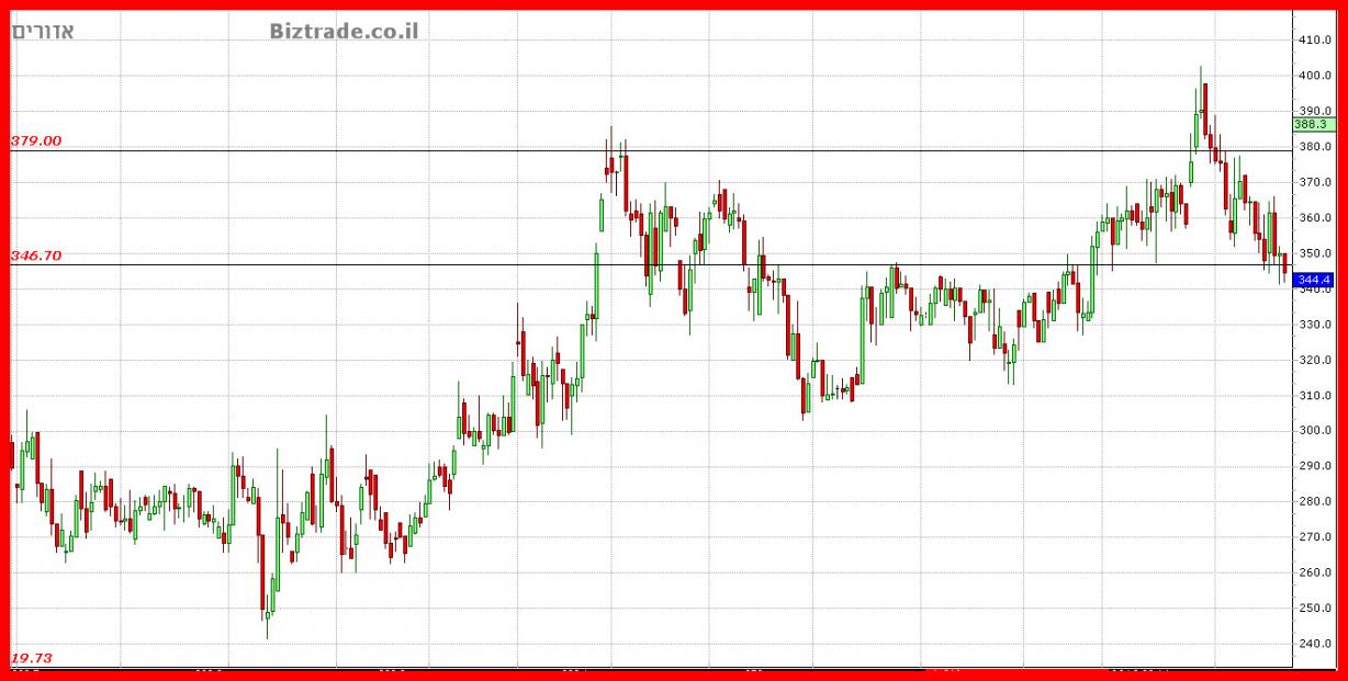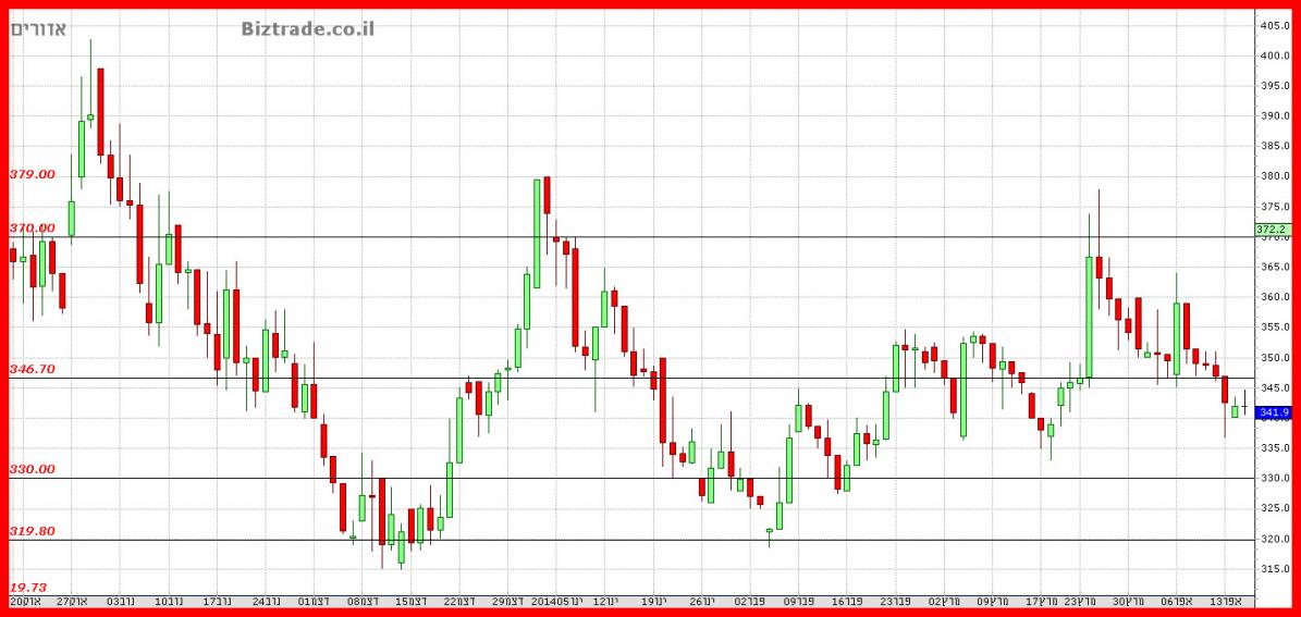שוברת ביום ה" את התמיכה החשובה ב 346, ובמידה והמחיר לא יחזור מהר ביום א" מעליו, הצפי יהיה שלילי עם ניסיון ירידה נוסף לאזור ה 340 - 330.