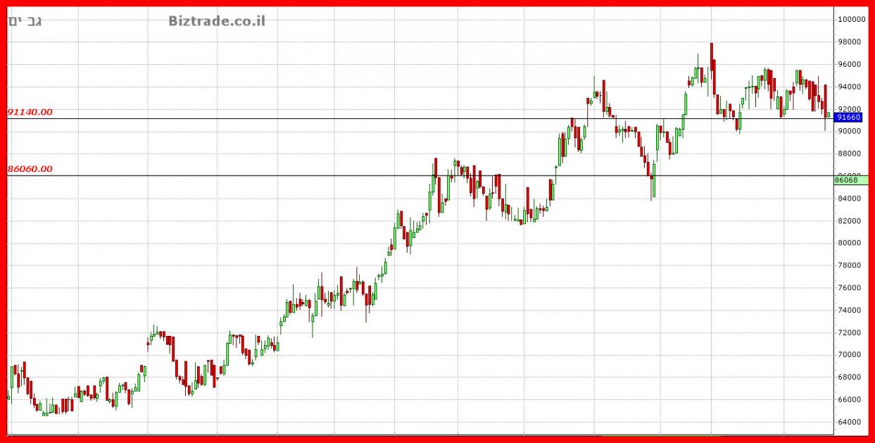 אומנם המתנדים הטכניים עדיין שליליים אבל המחיר לא שבר תמיכות חשובות, ומחזיק ב קו ה 91140 , ולמעשה רק שבירת ה 90000, מכניס את הגרף לאזור מאוד חלש עם צפי לירידה ל 88000, אבל כול עוד זה לא קורה, הסיכוי לחזרה לעליות בהמשך גדל.