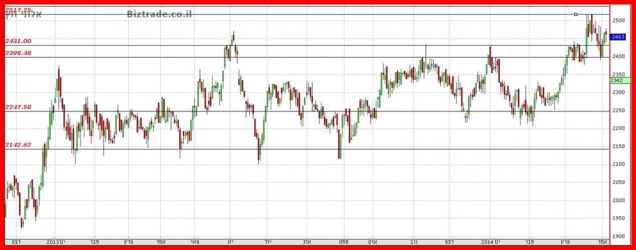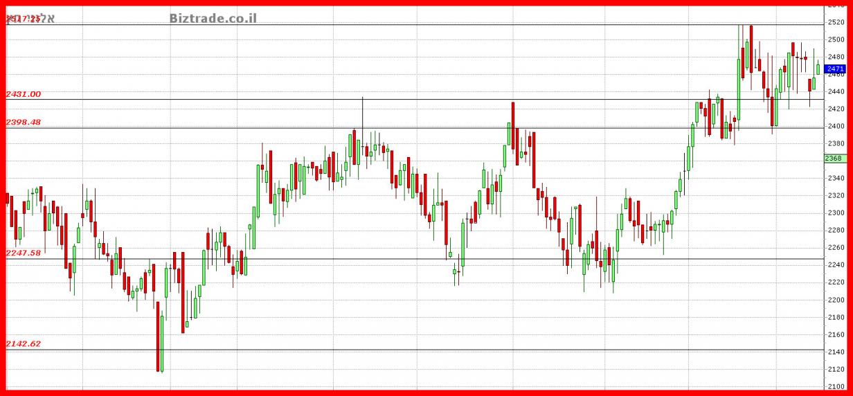 הדשדוש ממשיך בטווח הנתון שבין ה 2400 -- 2520, כך שאין שינוי בגרף זה ורק פריצה או שבריה יוכלו לתת את הכיוון.