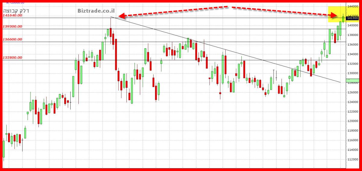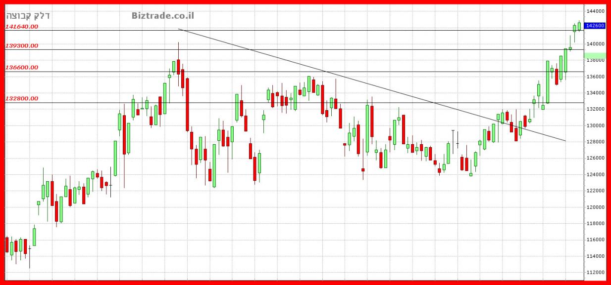 הגרף עומד בטווחים שנתנו בעדכון הקודם, וגם פורץ אתמול את ה 139300 , עם סגירה בסיום ב 139900 , כך שהמחיר צפוי להיות בכיוון לגבוה הקודם ב 141640 , בכדי להתמודד אתו.