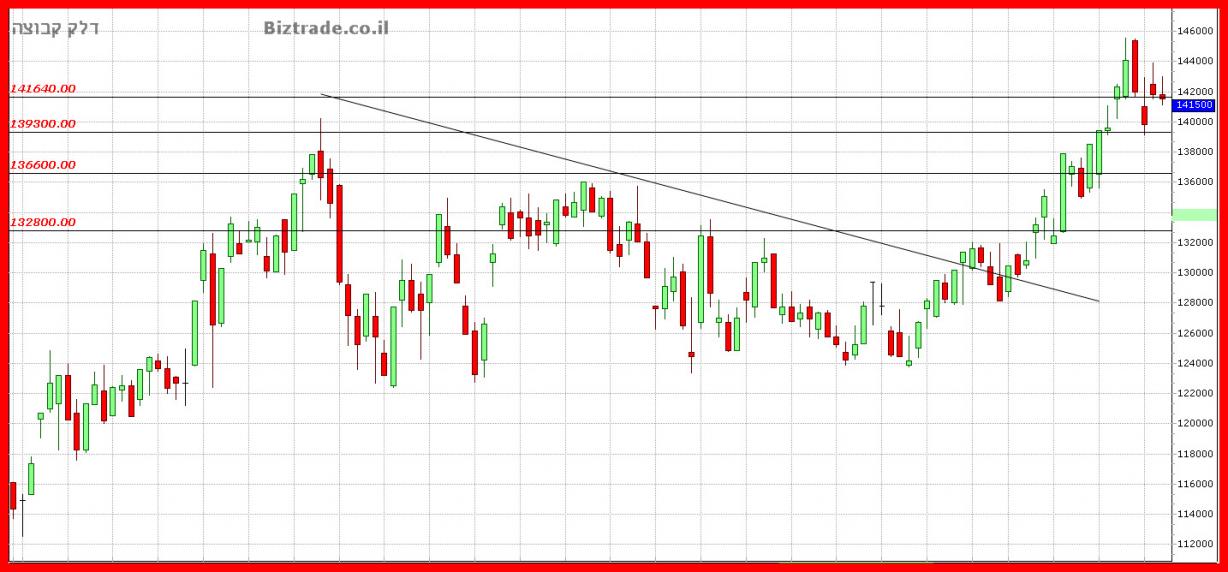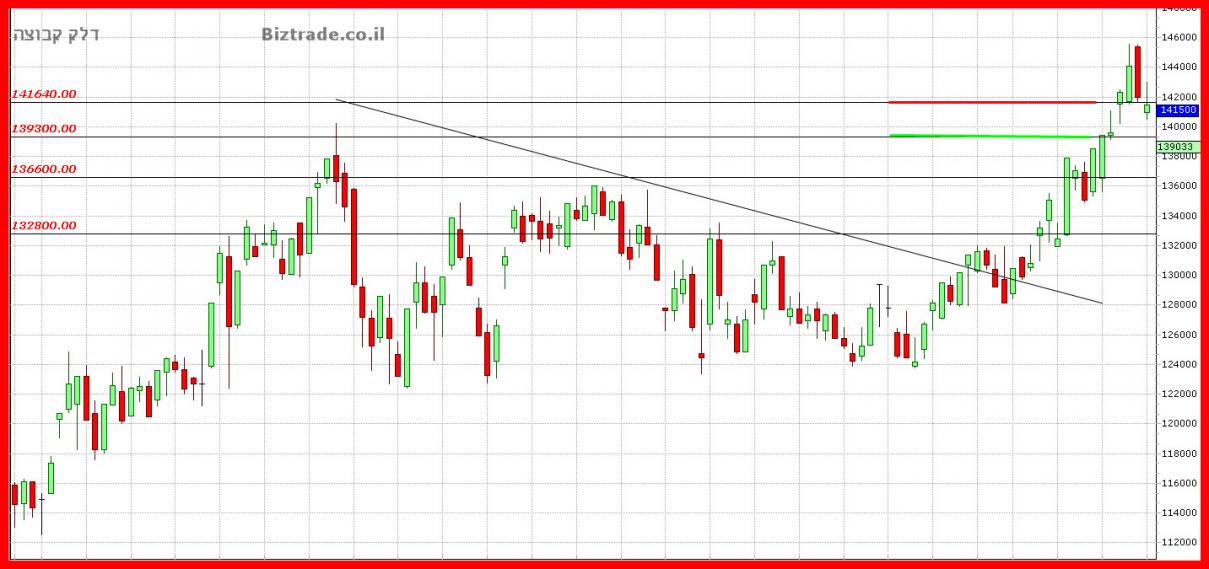המחיר כן ניסה אתמול לחזור מעל ה קו הטכני ב 139300 , וזו התנהגות הגרף בימים האחרונים, בתחילת המסחר הוא ירוק, ובסיומו הוא אדום,