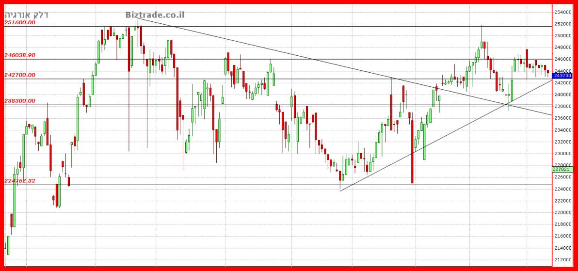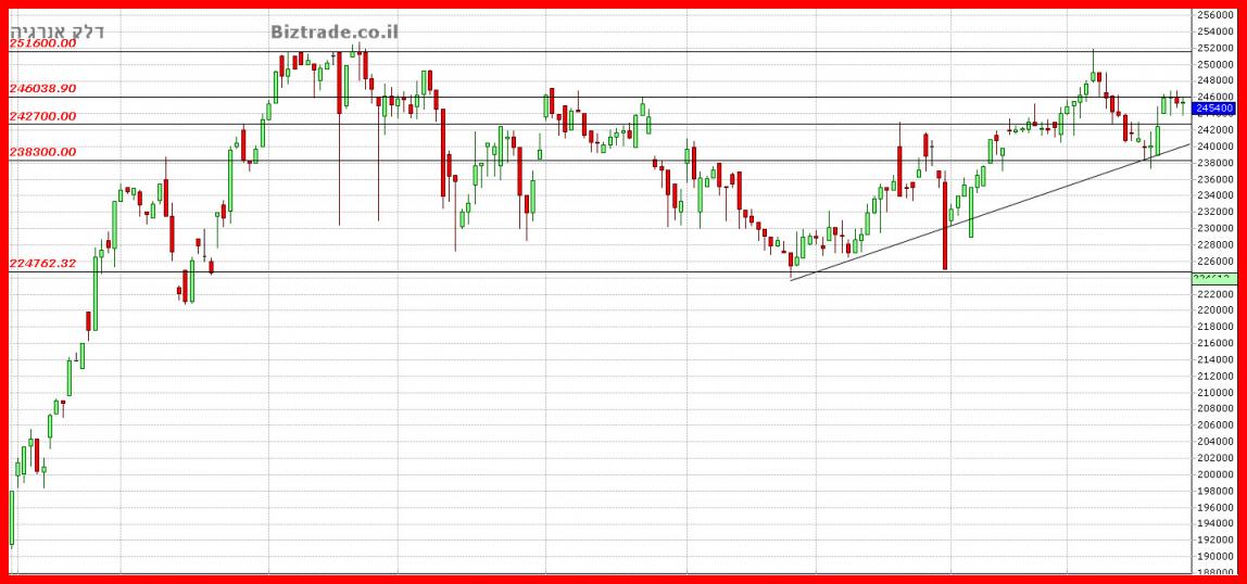 הוא יורדת לתמיכה ב 238000 , חוזר לעליות ונעצר ב 246000 במשך 4 ימי מסחר , ומגיע לסגירה שבועית ב 245400.