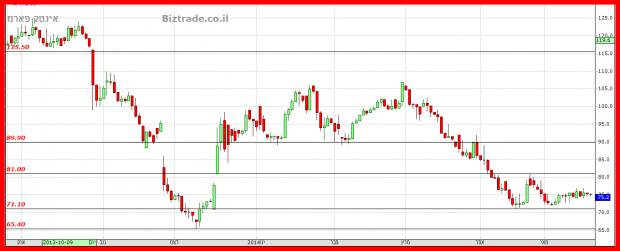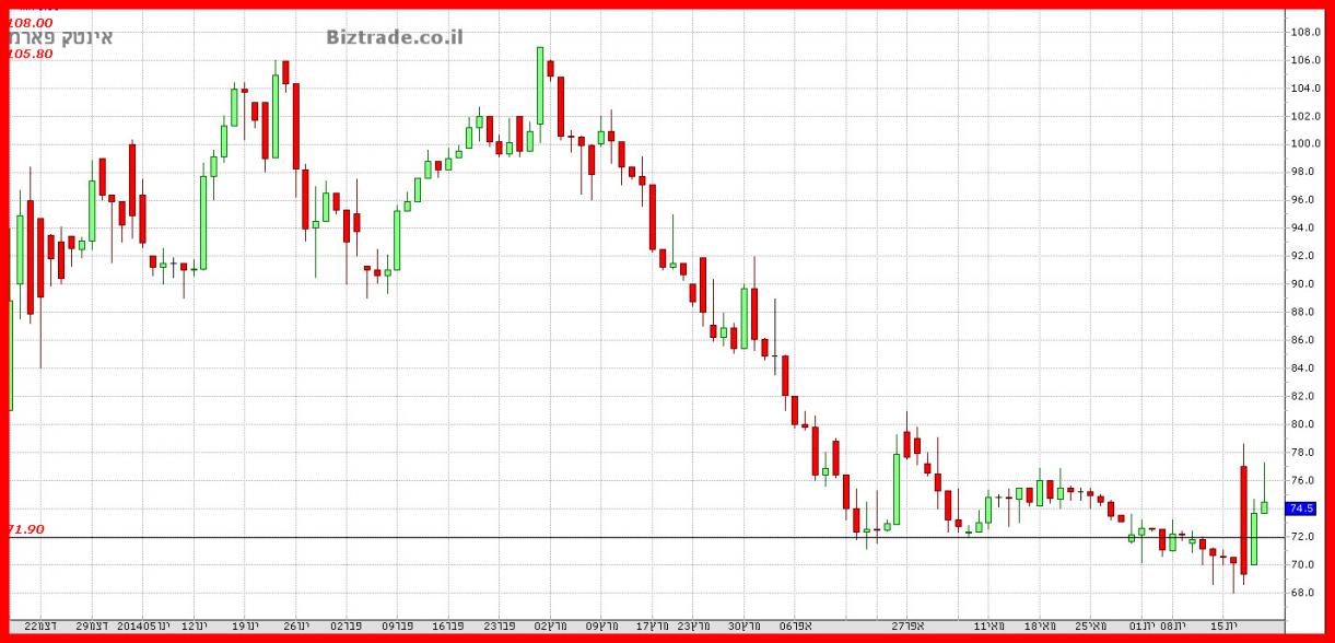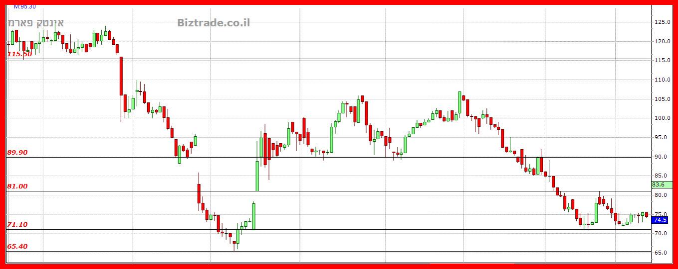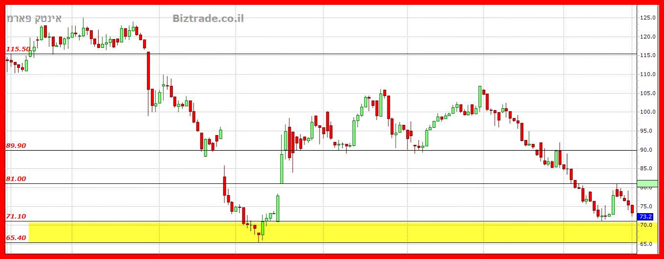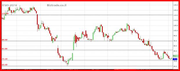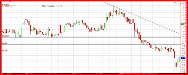 המחיר נמצא במהלך יורד מאז הנגיעה האחרונה ב קו ה 80 ומסיים היום עם סגירה ב 73 , כאשר התמיכה הקרובה נמצאת ב 71, ומתחת לזו תמיכה טכנית אחרונה ב 65,