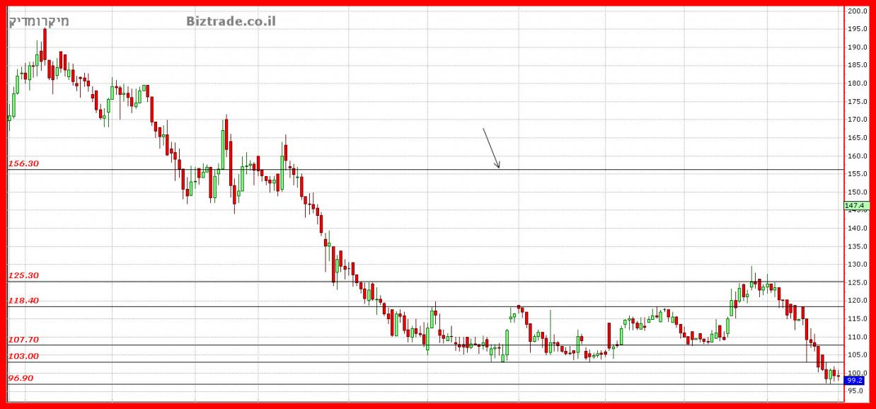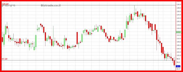 ניתן לראות בפירוט שהמחיר נמצא מתחת לקו 103 שהיא התמיכה ה טכנית האחרונה , וכרגע הגרף מנסה לבנות תמיכה נוספת ב 97.
