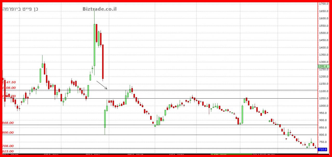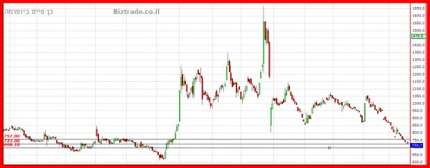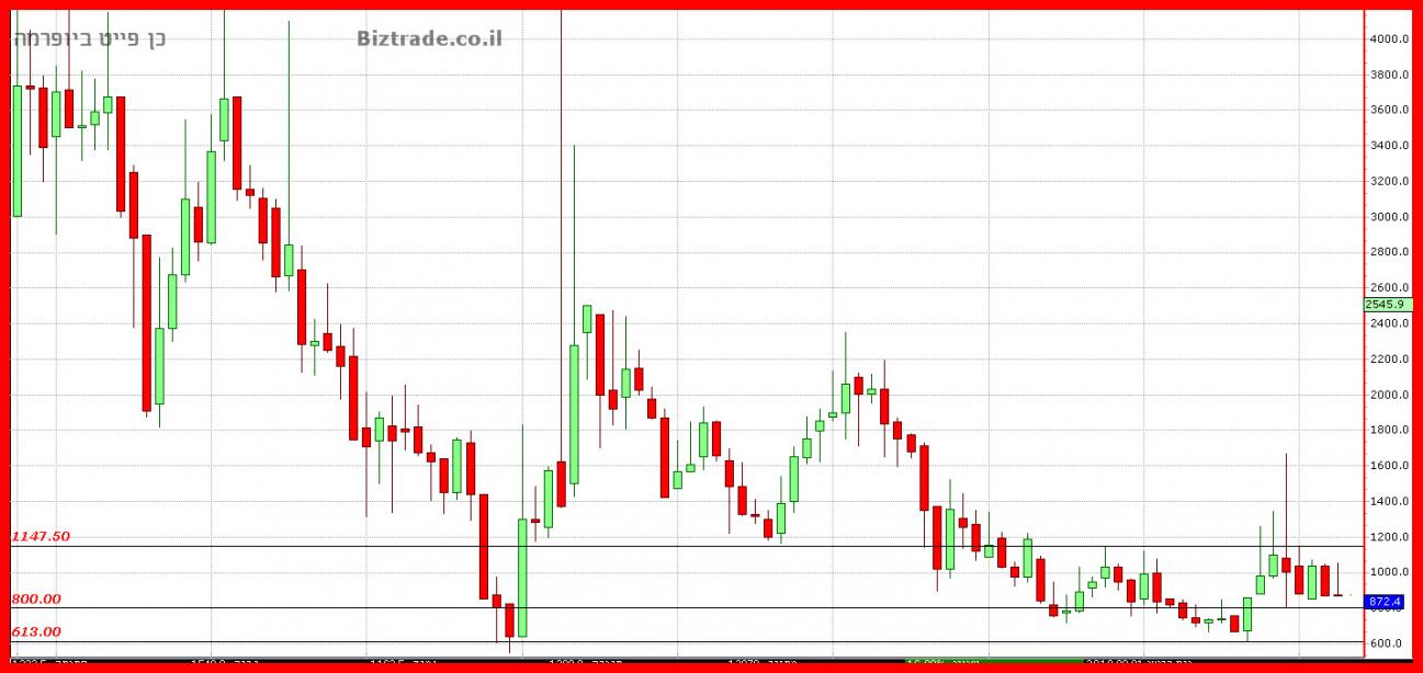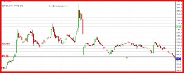 המחיר נמצא במהלך יורד , וקרוב מאוד לתמיכה ב 868 .כאשר בסה"כ הוא מדשדש בטווים שבין 868 -- 1050, ובהחלט יתכן שהוא עומד להתחיל סבב עולה אל הטווח העליון, בתנאי ש ה 868 לא ישבר מטה,,