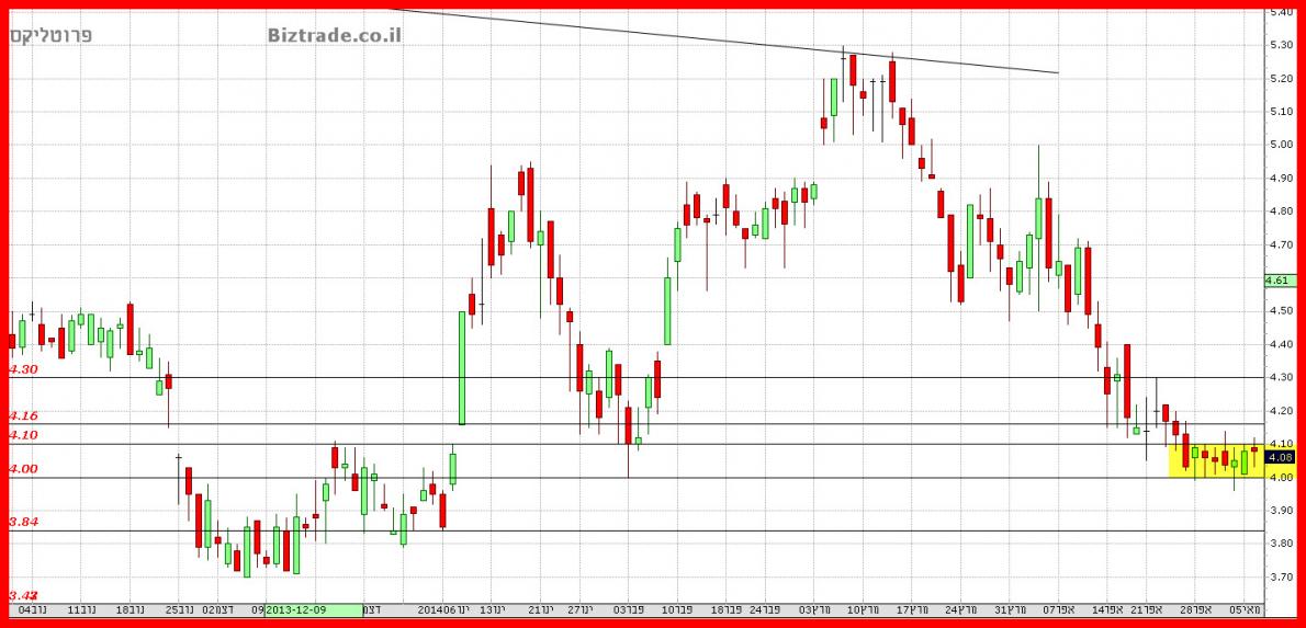 המחיר נמצא 6 ימי מסחר מתחת לקו ה 4.10$ , אבל מעל ה קו ב 4$ , ולמרות שכן היו ניסיונות לפריצה או שבירה, הקונים והמוכרים עומדים על שלהם בינתיים.