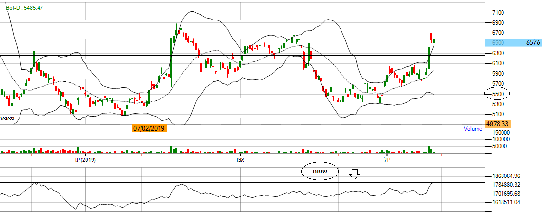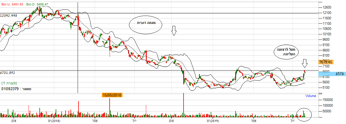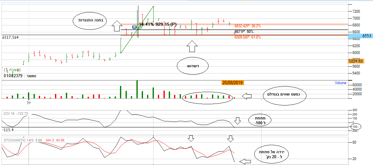 המניה עלתה בסוף חודש יולי כ- 15% בחנה התנגדות וחזרה לאיזור שער 6520 ומשם פתחה בדשדוש. ניתן לראות זאת על פי חיתוכי פיבונאצ'י , גרף המניה עולה יותר מ 4 פעמים לאיזור הגבול העליון ויורד לגבול התחתון.