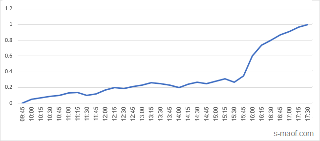כפי שניתן לראות, המסחר מתנהל במגמת עליה איטית יחסית לאורך מרבית היום אך הקפיצה מגיעה החל מסביבות השעה 16:00 לערך עם תנועה אלימה מעלה שלעיתים קרובות מכפילה עלית המדד ואף למעלה מכך. זהו סממן מובהק לפעילות הציבור בשוק שכן זוהי שעת רכישות / מכירות בקרנות, ולמעשה התנועה של הציבור המתורגמת ברובה לקרנות מעורבות / מניתיות באה לידי מימוש.